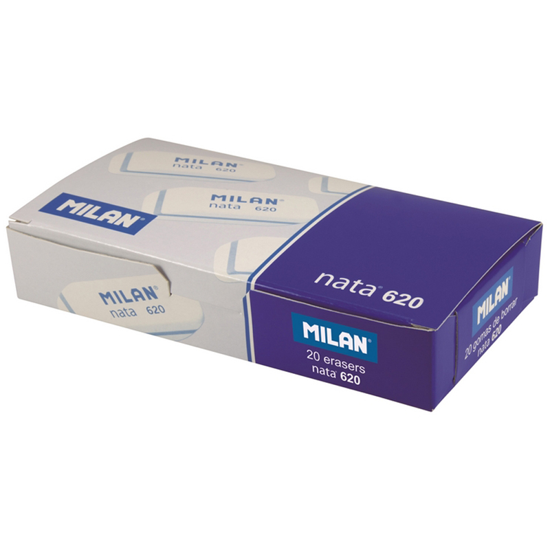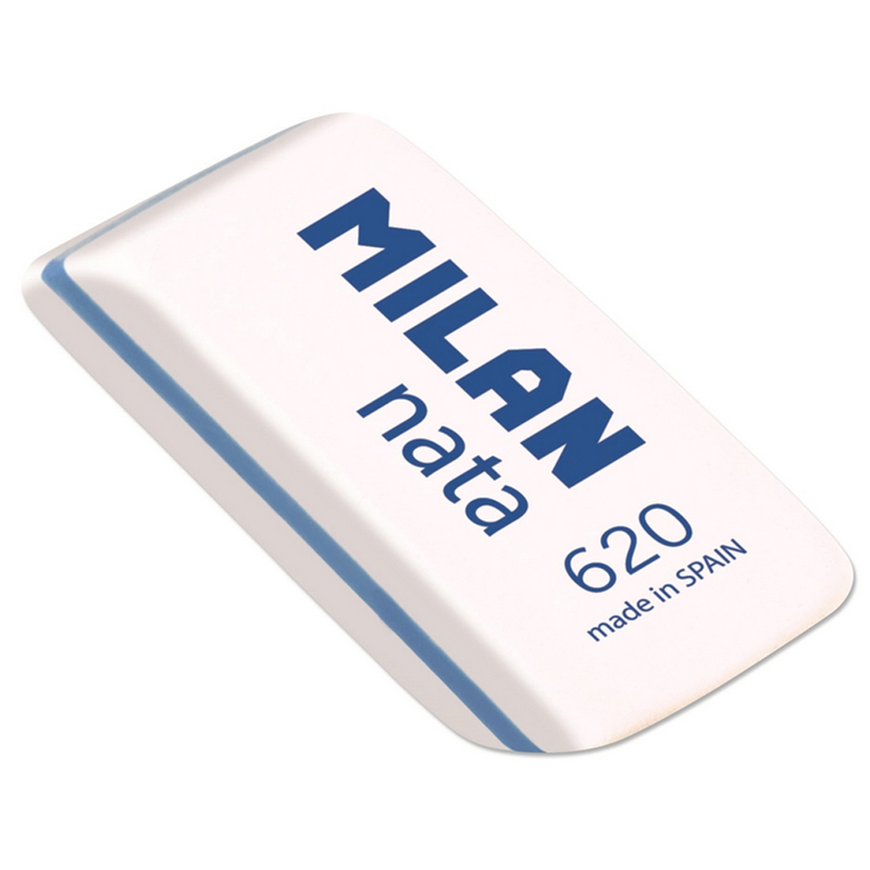 Белый пластиковый ластик Nata. Гладкий, универсальный и неабразивный. Стирает следы со всех поверхностей. Не повреждает бумагу. Белый скошенный ластик с бордюром разных цветов: синий, красный, зеленый. Размер ластика: 5,6×1,9×1,2 см.