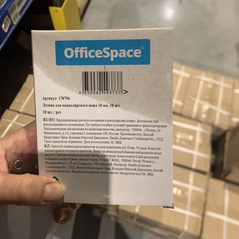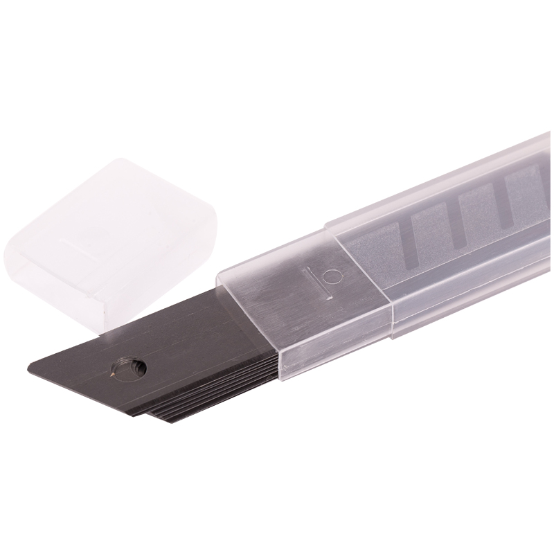 Лезвия для канцелярского ножа 10 шт в пластиковой коробке, ширина 18 мм<br/><br/>Причина уценки: Излишки масла вытекли из единичной упаковки (кейса). На промежуточной упаковке видны следы масла. Промежутка упакована в пакет с клеевым краем.