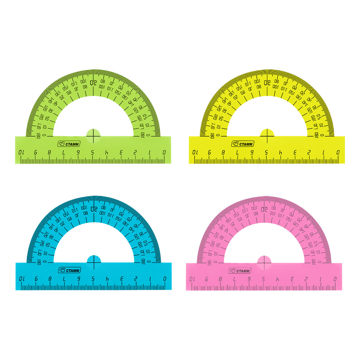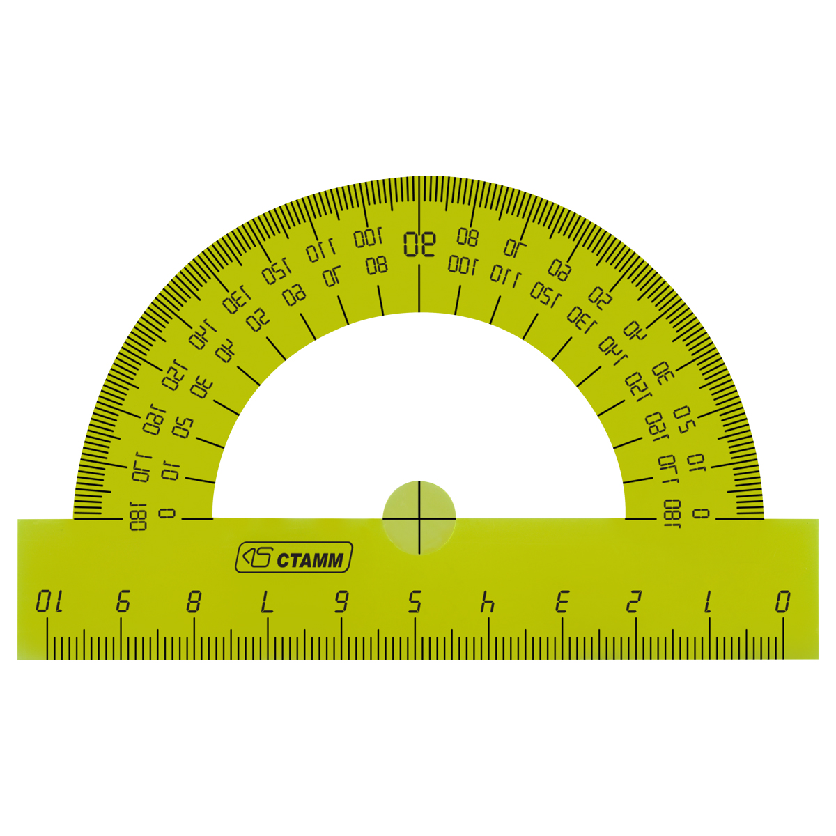 Транспортир СТАММ Neon Crystal – незаменим для чертёжных и измерительных работ. Окружность изделия – 180°, длина – 10 см. Товар является прочным. Отверстие для карандаша позволяет точно находить центр и вычерчивать окружность. У транспортира ровная и чёткая миллиметровая отливная шкала, безопасные закруглённые края и гладкая глянцевая поверхность.