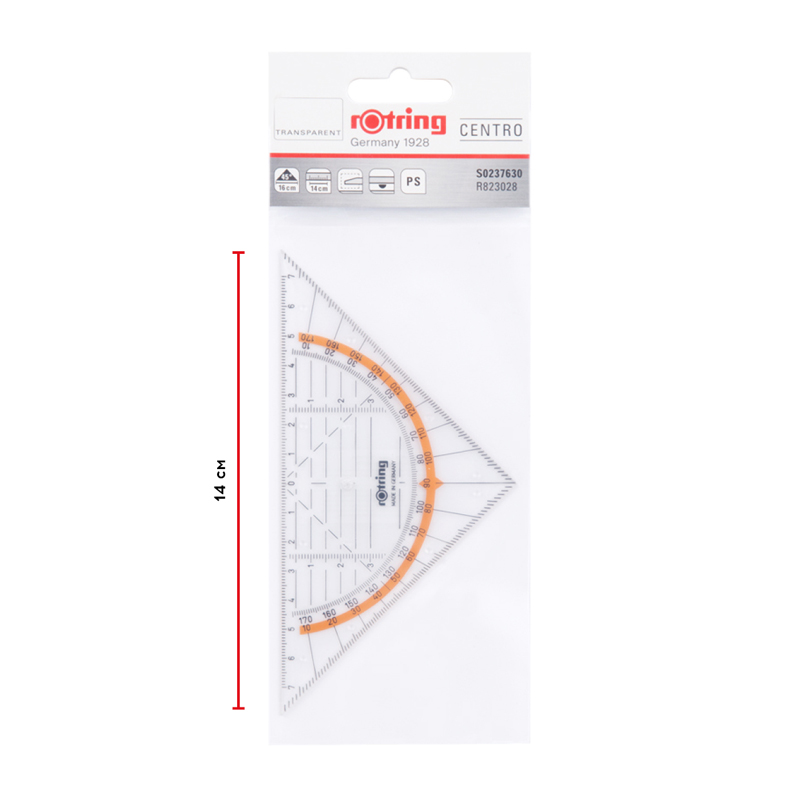Треугольник-транспортир Rotring предназначен для геометрических работ. Абсолютно прозрачный, из прочного пластика, нумерация градусов в противоположном направлении на цветном фоне, скошенный край, гипотенуза 16 см со шкалой 14 см.
