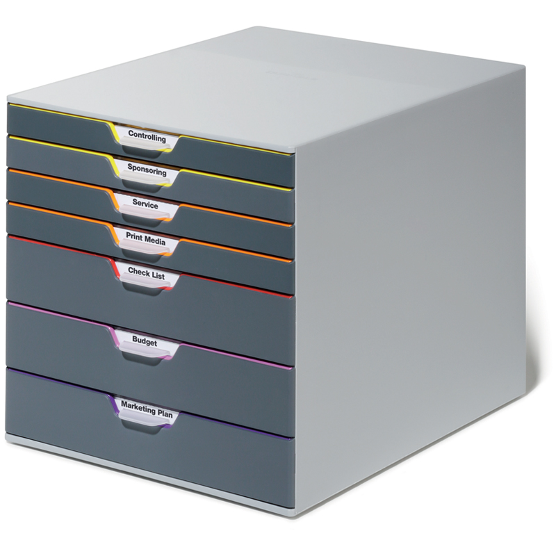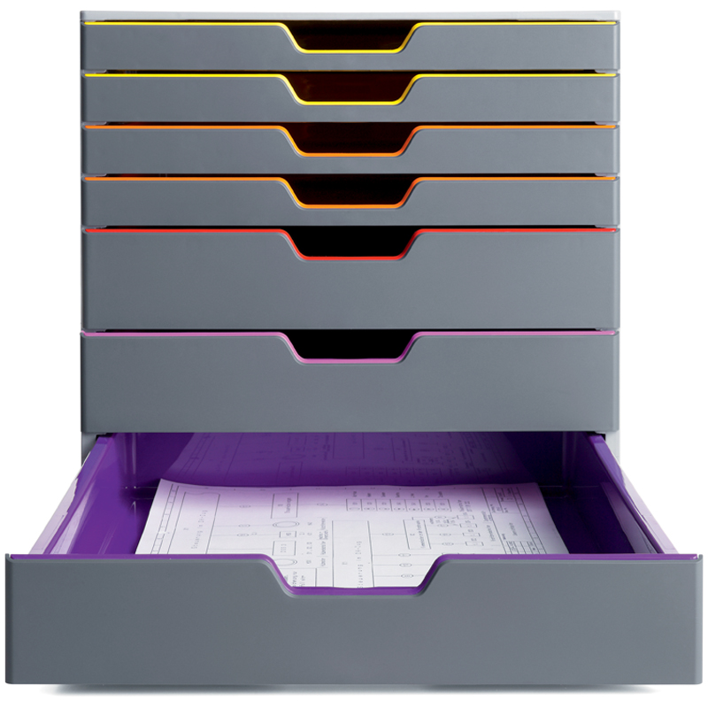 Бокс VARICOLOR для удобной работы с документами и корреспонденцией. Лотки, выполненные в различных цветах, помогают группировать бумаги по категориям и быстро находить нужный документ.<br/>• ударопрочный ABS-пластик премиального качества<br/>• 7 выдвижных ящичков в разных цветах. Подходят для документов форматов А4, С4, Folio<br/>• глубина узкого лотка - 22 мм, глубина широкого лотка - 48 мм<br/>• дополнительная маркировка каждого отделения благодаря съемным ручкам-табуляторам. Вкладыши для маркировки в комплекте<br/>• бокс оснащен стопорами, препятствующими выдергиванию лотков при резком открывании<br/>• универсальная конструкция короба позволяет миксовать лотки различной ширины при наличии нескольких моделей боксов<br/>В• высокая степень устойчивости<br/>• не скользит по поверхности благодаря прорезиненным ножкам <br/>• боксы можно устанавливать друг на друга<br/>• идеально подходит как для использования на рабочем столе, так и для размещения на полках шкафов<br/>• рекомендован для офисного и домашнего использования, в том числе для учебного и творческого процесса
