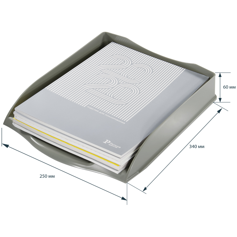Горизонтальный лоток для хранения бумаг формата А4 представлен в стильном современном дизайне. Корпус представлен в сером цвете. Лотки могут устанавливаться один на другой.
