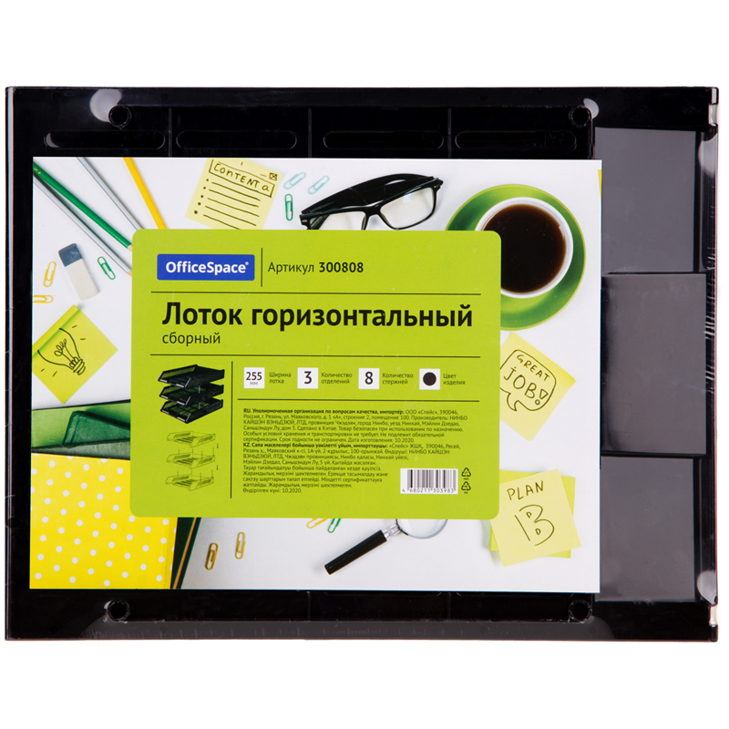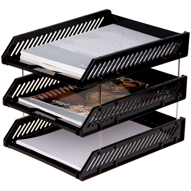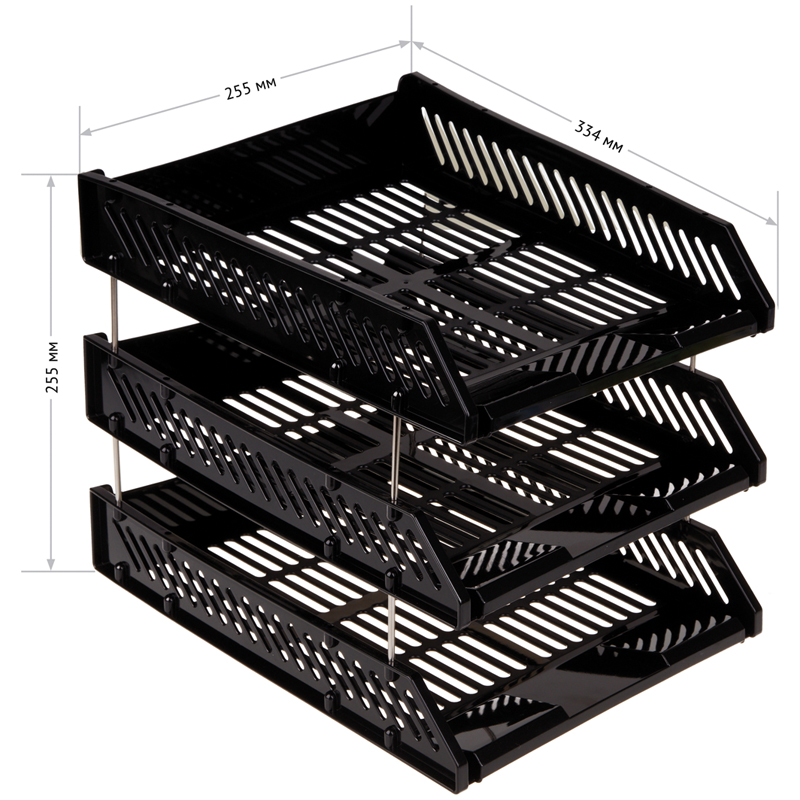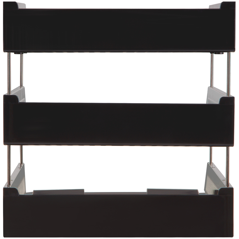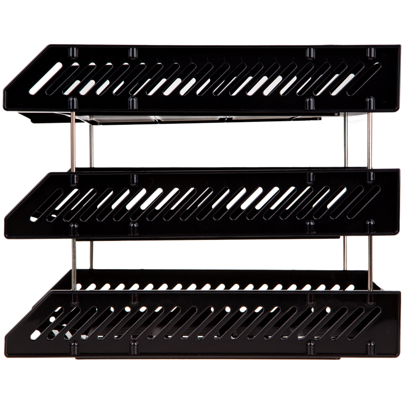 Лоток для хранения бумаг, сборный, 3 отделения, цвет черный. Секции крепятся между собой с помощью металлических стержней, которые идут в комплекте с лотком. Верхняя секция может разворачиваться на 90 градусов. Упаковка в термопленку.