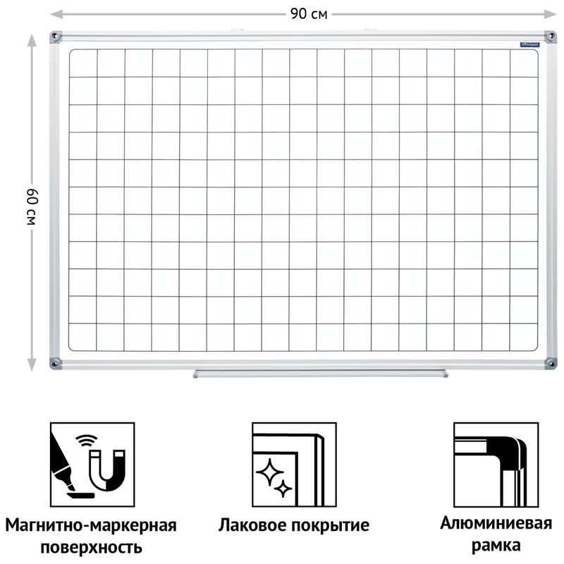 <br/>Магнитно-маркерная доска OfficeSpace в клетку идеально подойдёт для проведения тренингов, совещаний и презентаций. Размер: 600*900 мм. Белое лаковое покрытие предназначено для письма специальными маркерами. Металлическая поверхность также позволяет размещать объявления при помощи магнитов. Алюминиевая рамка с укреплёнными пластиковыми уголками гарантирует прочность конструкции и длительный срок службы. Предусмотрена возможность как горизонтального, так и вертикального монтажа доски на поверхности. Комплектация: полочка для аксессуаров, крепежные элементы, инструкция.<br/>• Тип доски: односторонняя;<br/>• Материал рабочей поверхности: металл;<br/>• Размещение: настенное;<br/>• Размер: 600*900 мм;<br/>• Цвет рабочей поверхности: белый.<br/>• Размер клетки 50*50 мм.