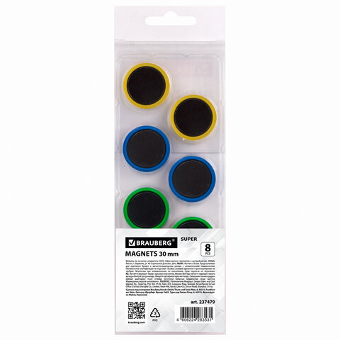 Диаметр магнитов составляет 30 мм. 8 штук в комплекте. Надежно удерживаются на любой железной или стальной поверхности. Магниты BRAUBERG "SUPER" отличаются повышенной удерживающей магнитной силой. Магниты круглой формы выполнены из пластика цветов ассорти. Поставляются в прозрачном пластиковом боксе с европодвесом.