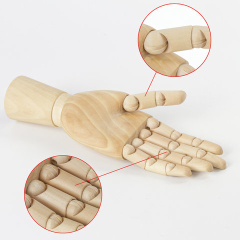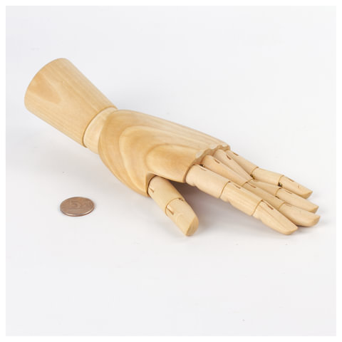 Манекен изготовлен из дерева, представляет из себя модель женской левой руки, способной сгибаться в местах сгиба фаланг пальцев и в области запястья. Соединения предоставляют возможность зафиксировать модель в необходимом положении. Манекен является отличной альтернативой живой натуре, поскольку не может случайно это положение поменять. Высота - 25 см. Упакован в белую коробку.