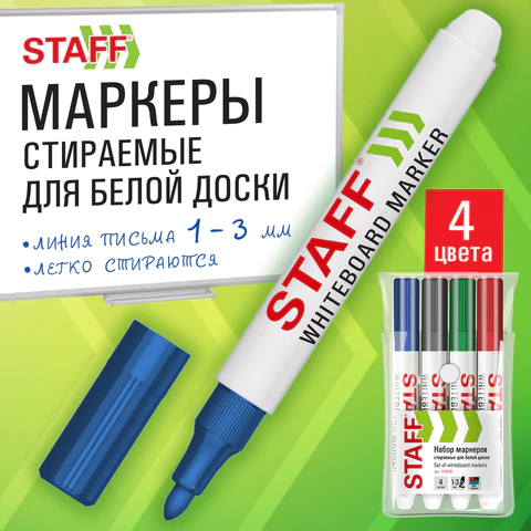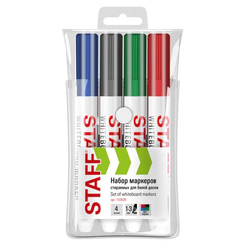 Набор маркеров STAFF "BASIC" WBM-200 – это ваш ключ к красочным и структурированным презентациям. Четыре классических цвета (черный, синий, красный, зеленый) помогут выделить главное, систематизировать информацию и визуализировать ее.