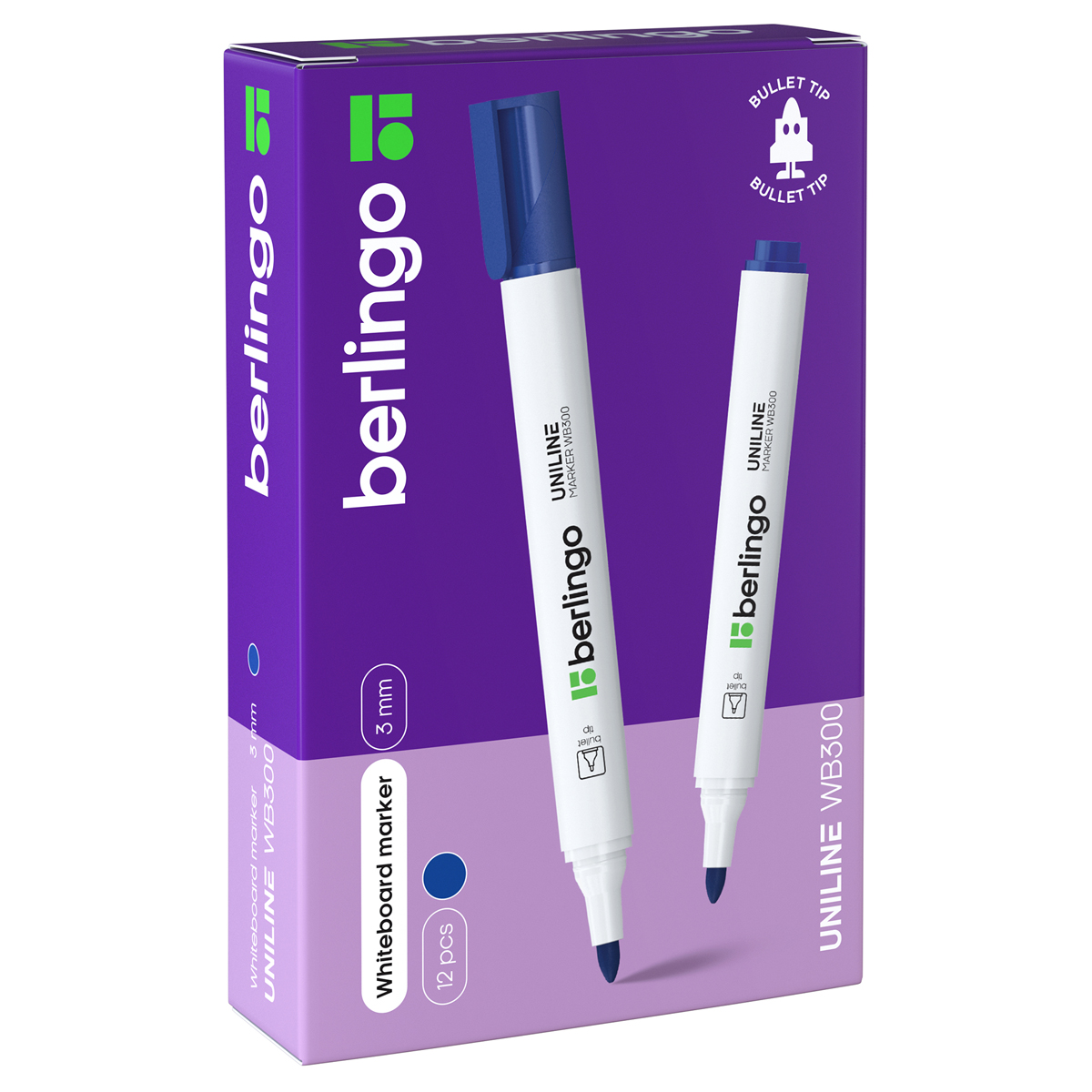 Маркер Berlingo Uniline WB300 предназначен для письма на досках с магнитно-маркерной поверхностью. Маркер синего цвета представлен с пулевидным пишущим узлом. Ширина линии письма – 3 мм. Длина непрерывной линии – 500 метров. Чернила на спиртовой основе легко стираются сухой губкой для досок. Плотный колпачок с клипом надежно предотвращает высыхание, а его цвет соответствует цвету чернил. Эксклюзивное матовое покрытие пластикового корпуса диаметром 16 мм создает уникальный внешний вид и обеспечивает максимальный комфорт при использовании. Упакован в картонную коробку по 12 штук.<br/>• Цвет: синий;<br/>• Ширина линии письма: 3 мм;<br/>• Длина линии письма: 500 м.