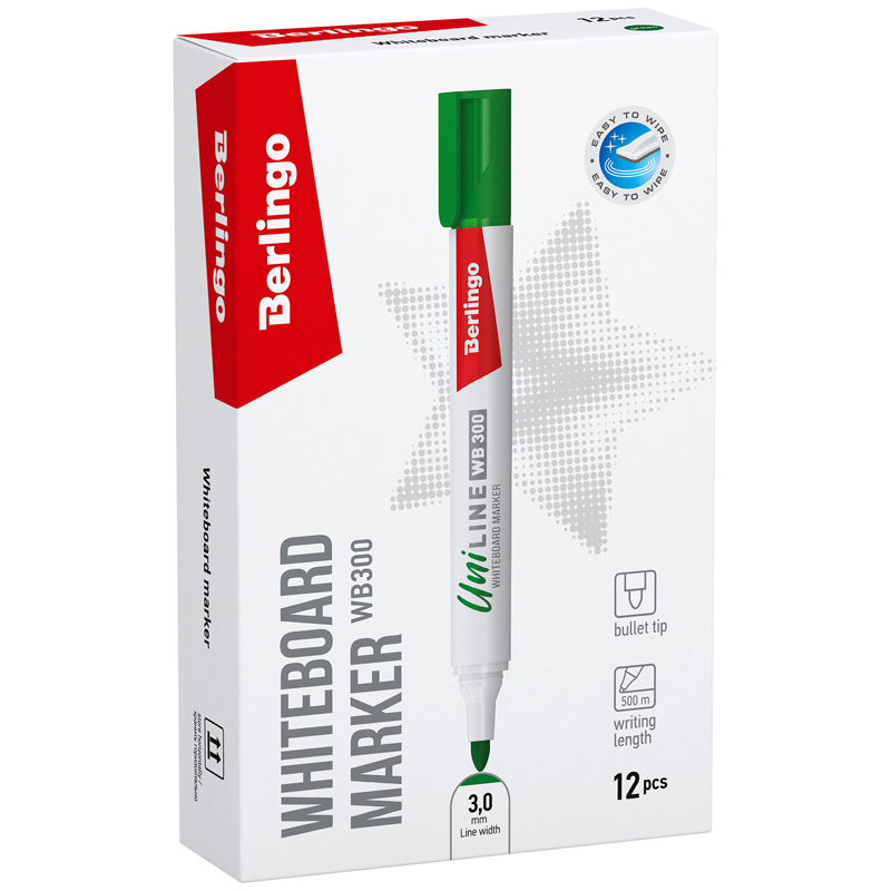 Маркер Berlingo Uniline WB300 предназначен для письма на досках с магнитно-маркерной поверхностью. Маркер зеленого цвета представлен с пулевидным пишущим узлом. Ширина линии письма – 3 мм. Длина непрерывной линии – 500 метров. Чернила на спиртовой основе легко стираются сухой губкой для досок. Плотный колпачок с клипом надежно предотвращает высыхание, а его цвет соответствует цвету чернил. Эксклюзивное матовое покрытие пластикового корпуса диаметром 16 мм создает уникальный внешний вид и обеспечивает максимальный комфорт при использовании. Упакован в картонную коробку по 12 штук.