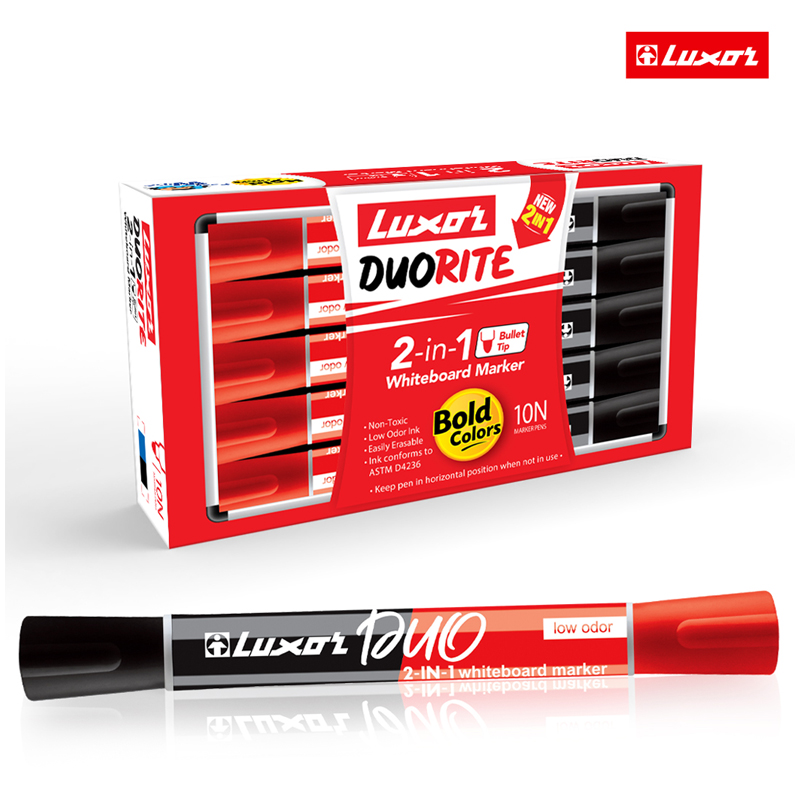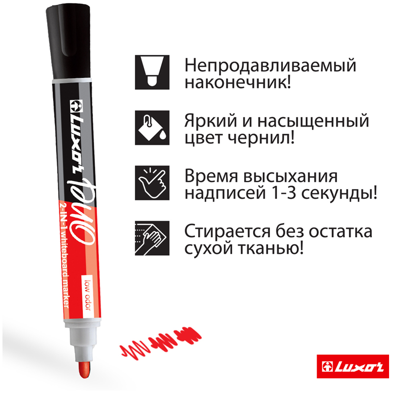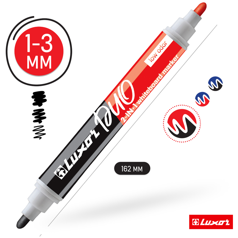 Маркер двухсторонний Luxor "Duorite" предназначен для использования на досках с магнитно-маркерной поверхностью. Чернила на спиртовой основе быстро высыхают на поверхности доски. След от маркера легко удаляется сухой губкой. Яркая линия письма. Круглая форма наконечника. Уникальное предложение - два цвета в одном маркере. Ширина линии письма 1-3 мм. Цвет чернил - черный/красный.