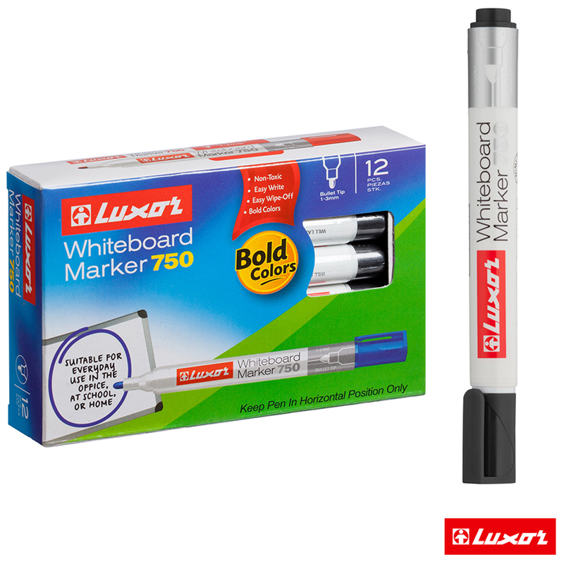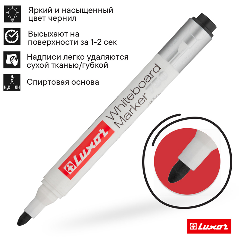 Маркер для доски Luxor 750 предназначен для надписей на досках с магнитно-маркерной и на других непористых поверхностях: стекло, фарфор, пленка. <br/>Благодаря особому строению пишущего узла чернила дозированно поступают на поверхность, не вытекают из наконечника и не образуют клякс. Чернила на спиртовой основе высыхают на поверхности доски в течение 1-2 секунд. Маркер до 2 дней не высыхает без колпачка, а при закрытом колпачке в течение одного часа полностью восстанавливает свои свойства! <br/>Прочный фибровый наконечник не западает в корпус и сохраняет форму на протяжении всего срока службы. След от маркера легко удаляется сухой губкой. Пулевидный наконечник позволяет наносить яркие и однородные линии толщиной 1-3 мм. Цвет чернил - черный. Упаковка: картонная коробочка по 12 штук.<br/>Пиши ярко и стирай без остатка маркерами для белых досок TM Luxor!