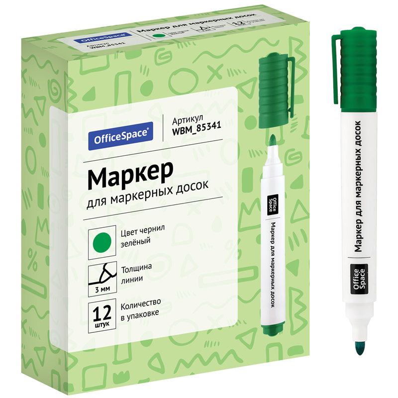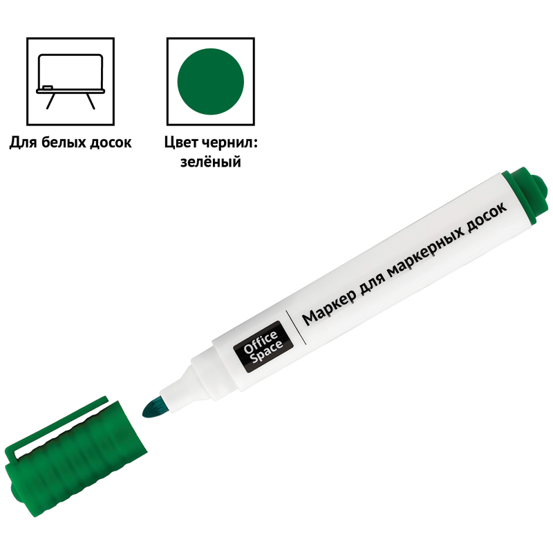 Маркер OfficeSpace предназначен для письма на магнитно-маркерных досках. Толщина линии: 3 мм. Закруглённый пишущий узел. Чернила на спиртовой основе легко стираются сухой губкой для досок. Плотный колпачок с клипом надёжно предотвращает высыхание. Хранить с закрытым колпачком.<br/>• Цвет чернил: зелёный;<br/>• Толщина линии: 3 мм;<br/>• Форма наконечника: пулевидный;<br/>• Форма корпуса: круглая.