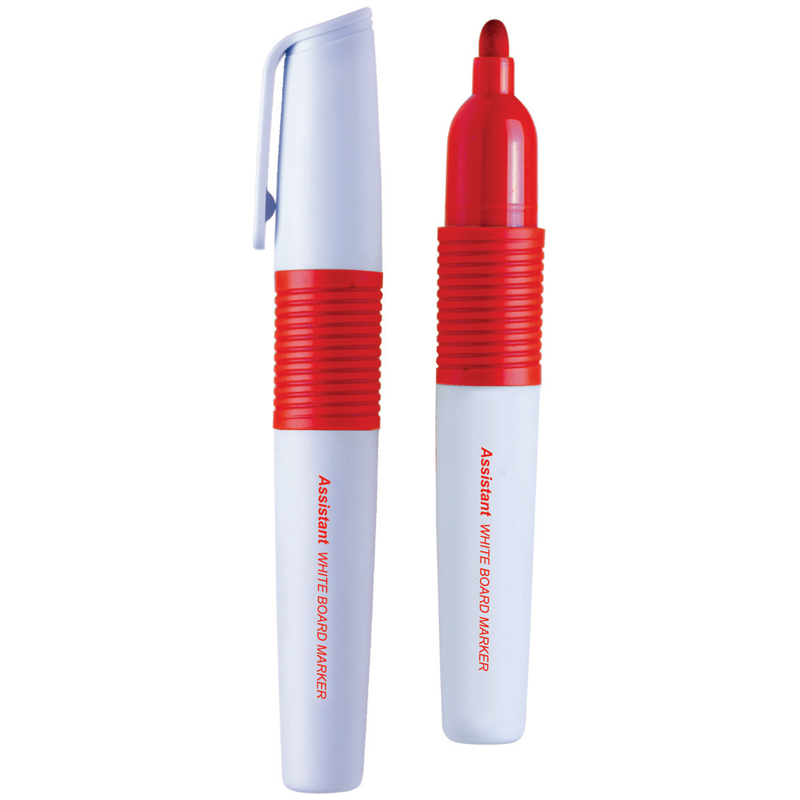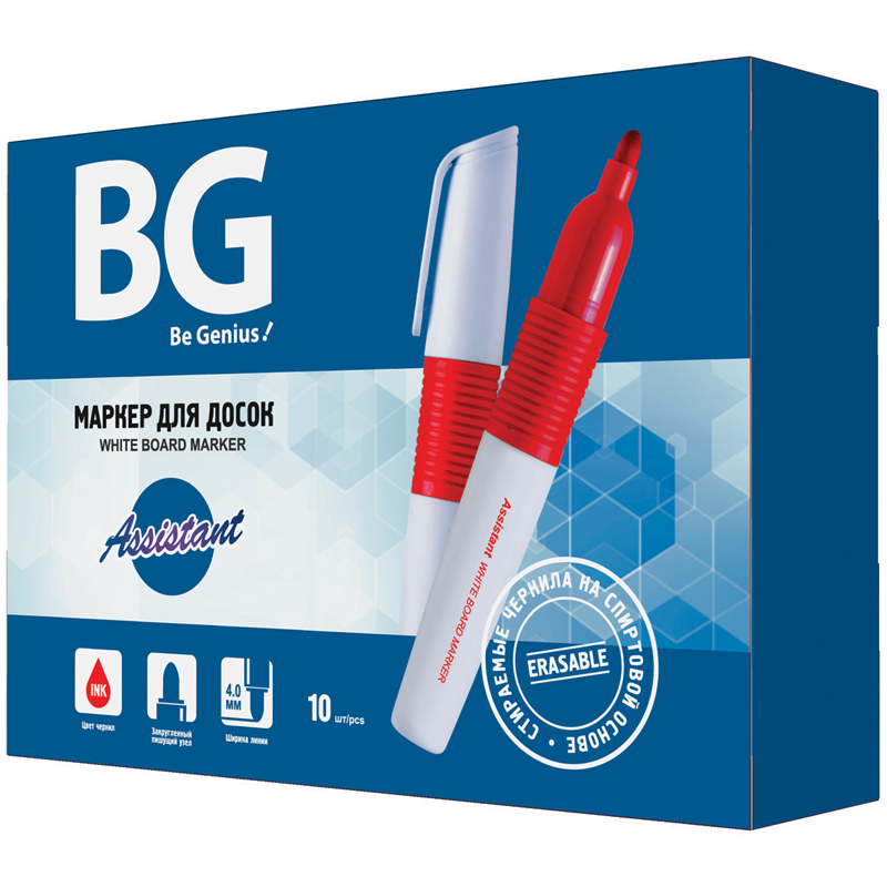 Маркер перманентный BG Assistant с чернилами красного цвета на спиртовой основе предназначен для белых эмалевых досок. Круглый корпус маркера диаметром 10 мм выполнен из пластика. Толщина линии составляет 4 мм. <br/>• цвет чернил: красный;<br/>• толщина линии письма: 4 мм;<br/>• основа чернил: спиртовая.