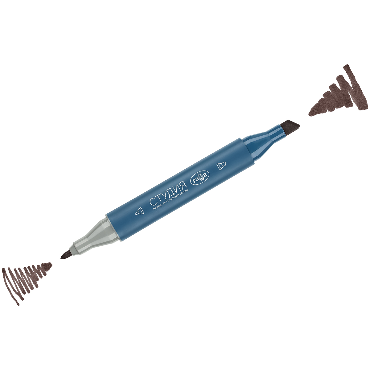 Маркер для скетчинга двусторонний ГАММА серии «Студия» – выбор профессионалов, любителей и начинающих художников, дизайнеров и иллюстраторов. Цвет – коричневый тёмный. Перманентные чернила на спиртовой основе не токсичны и быстро сохнут на поверхности, оставляя яркий след. Маркер на спиртовой основе имеет два наконечника: пулевидный с шириной линии 1 мм и долото (клиновидный) 2-6 мм. Пулевидный наконечник подойдет для прорисовки деталей, работ в различных графических техниках, создания текстур и проработки контуров. Клиновидный наконечник идеален для работ на больших поверхностях и тех, кто занимается каллиграфическими техниками, так как он позволяет варьировать ширину линии. Маркеры для рисования мягко ложатся на поверхность, создавая ровный цвет без разводов. Цвета отлично смешиваются между собой, образуют плавные переходы и новые оттенки. Маркерами можно рисовать на бумаге, холсте и других поверхностях. Трехгранный матовый корпус диаметром 1, 55 мм из полипропилена нежно-голубого цвета легкий и ударопрочный. Плотно защелкивающийся колпачок обеспечивает долгую сохранность чернил от высыхания. Также на нём указан номер цвета. Маркеру не страшны морозы, так как спирт замерзает только при температуре –114 °C.