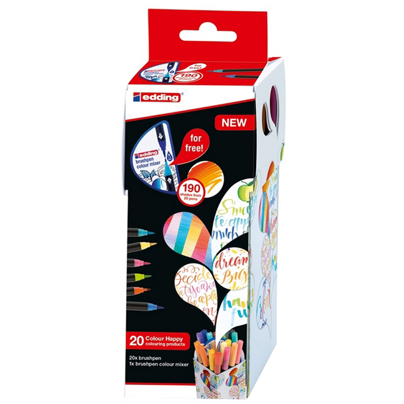 Набор принадлежностей для творчества edding Colour Happy Small. Набор включает 20 цветовых вариантов ручки-кисти edding 1340 и инструмент ддля смешивания цветов. При помощи этого инструмента вы можете добиться эффекта градиента (плавного перехода от одного цвета к другому), а так же получить новые цвета.