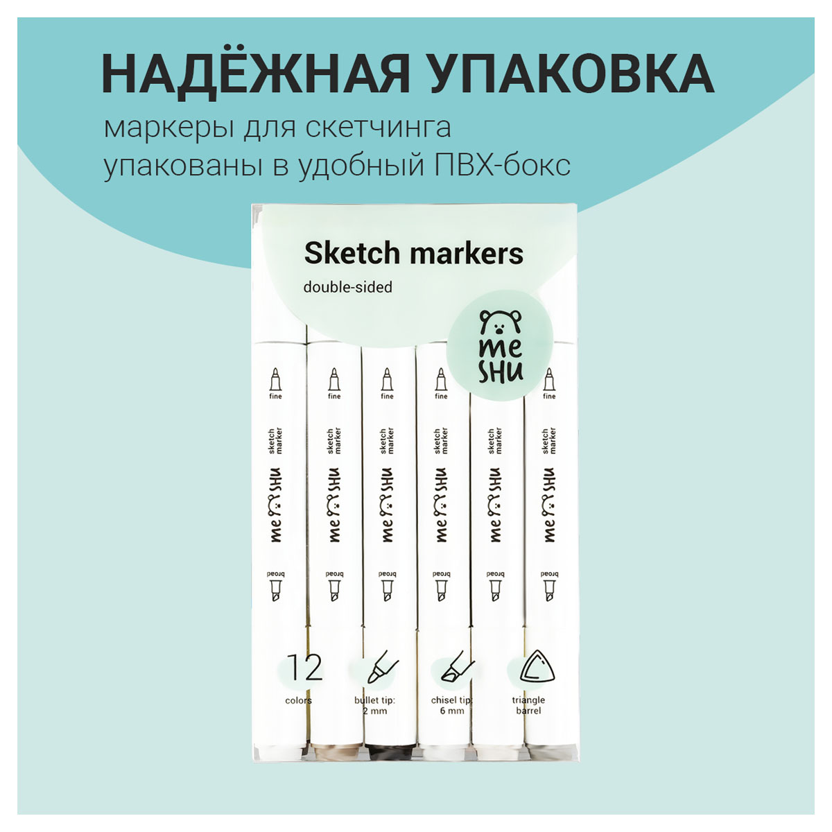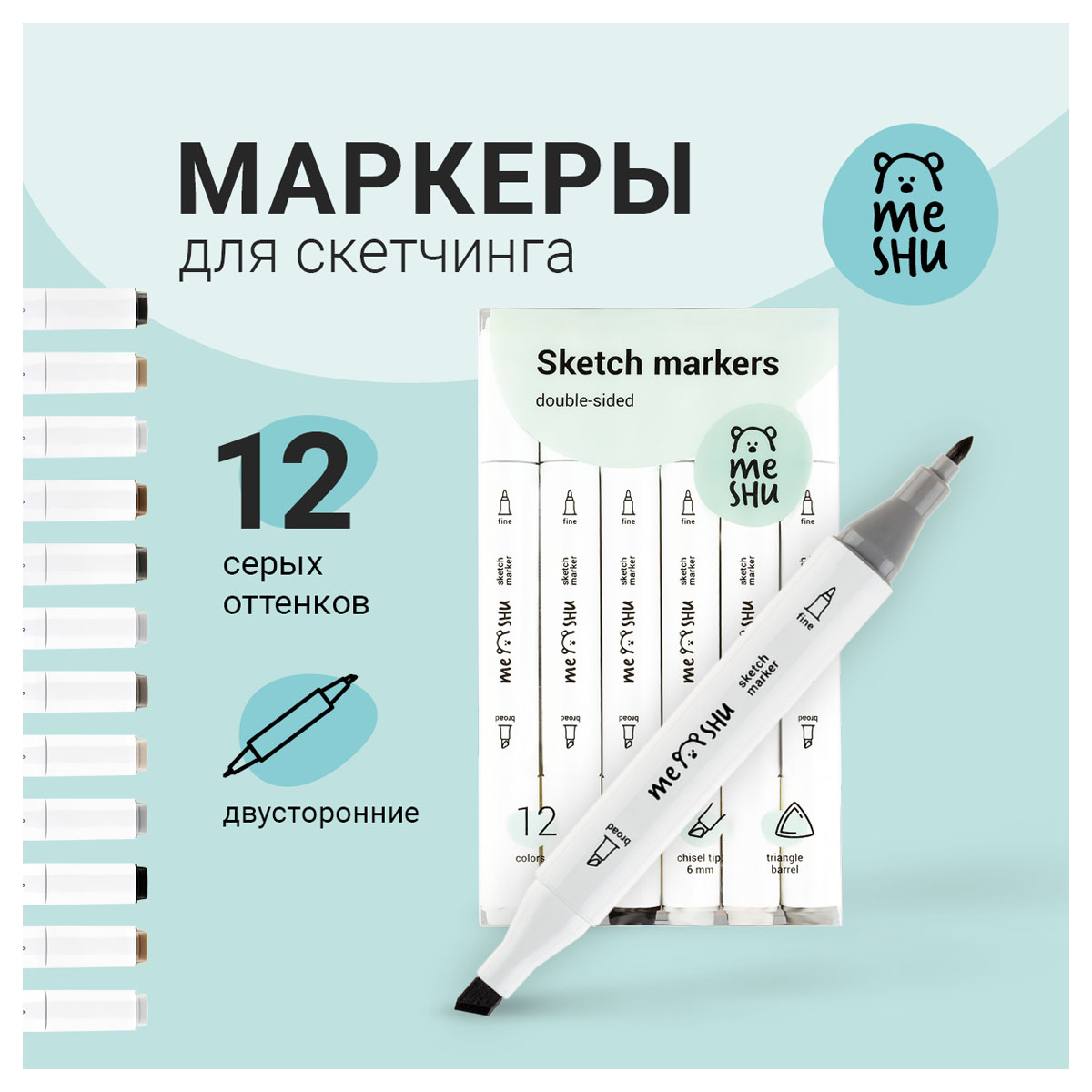Набор двусторонних маркеров для скетчинга Meshu - идеальный выбор для художников, дизайнеров, иллюстраторов и любителей скетчинга, подходят для создания анимэ и манги. Эргономичный трехгранный корпус удобно лежит в руке и позволяет эффективно прорабатывать мелкие детали рисунка. Чернила на спиртовой основе - быстро высыхают, водостойкие, нетоксичны и не портят поверхность бумаги. Маркеры обладают пулевидным (2мм) и скошенным (6 мм) наконечниками, что позволяет прорабатывать как мелкие детали рисунка. так и закрашивать большие области.