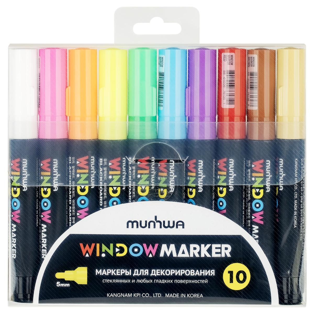 Набор меловых маркеров для декорирования MunHwa Window станет незаменимым помощником для воплощения всех креативных решений в жизнь. Он предназначен для стеклянных и любых гладких (непористых) поверхностей. MunHwa Window – жидкий мел на водной основе. В наборе 10 ярких цветов: белый, голубой, неоновый зеленый, неоновый розовый, неоновый оранжевый, неоновый желтый, фиолетовый, алый, терракотовый, светло бежевый. <br/>Маркер рекомендуется к использованию на белых и черных досках, для декорирования зеркал и стекол, оформления окон, для нанесения надписей на металл, пластик и другие ГЛАДКИЕ поверхности. Маркеры, нанесенные на гладкую поверхность, можно удалить влажной тканью. <br/>Благодаря высококачественному механизму и составу мел поступает дозированно, ложится на поверхность равномерным и однородным слоем, полностью закрашивая обрабатываемую поверхность. <br/>Меловой маркер не крошится, не осыпается при нанесении и не пачкает руки. Клапанный механизм пишущего узла исключает растекание и разбрызгивание, преждевременное пересыхание маркера. Маркеры не рекомендуется использовать по шершавым, пористым поверхностям: частицы краски забьются в поры и неровности, откуда их сложно будет извлечь.<br/>Меловые маркеры – идеальный инструмент для детского творчества. Они имеют яркие цвета, которые особенно эффектно сморятся на темных поверхностях. <br/>Инструкция по применению:<br/>1) Встряхнуть маркер с закрытым колпачком.<br/>2) Открыть колпачок. Удерживая маркер в вертикальном положении, несколько раз надавить стержнем на поверхность до тех пор, пока краска не поступит в пишущий узел.<br/>3) Выполнить надпись или рисунок. Дать составу высохнуть в течение 40-60 секунд.<br/>4) Плотно закрыть колпачок.<br/>Набор упакован в пластиковый чехол с европодвесом.<br/>• Количество цветов: 10.