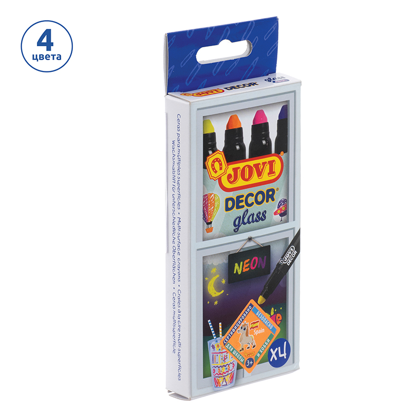 Выкручивающиеся восковые мелки JOVI Décor glass предназначены для декорирования стекла и других гладких поверхностей: стекло, зеркало, глазированная керамика, бумага. Диаметр корпуса составляет 15 мм. В наборе 4 ярких неоновых цвета: жёлтый, оранжевый, розовый и фиолетовый. Мелки с пулевидным наконечником обладают высокой покрывающей способностью. Представлены в пластиковом корпусе, не пачкают руки и не имеют запаха. Легко смываются с помощью влажной губки или салфетки. Упакованы в картонную коробку с европодвесом. Страна производства Испания.<br/>• Количество цветов: 4;<br/>• Диаметр корпуса: 15 мм