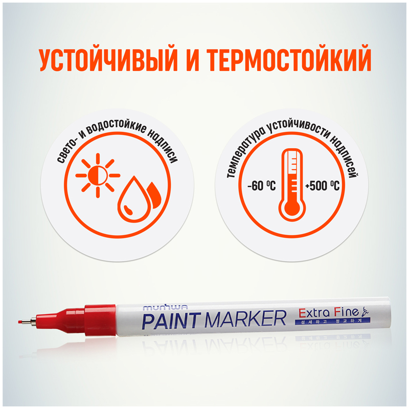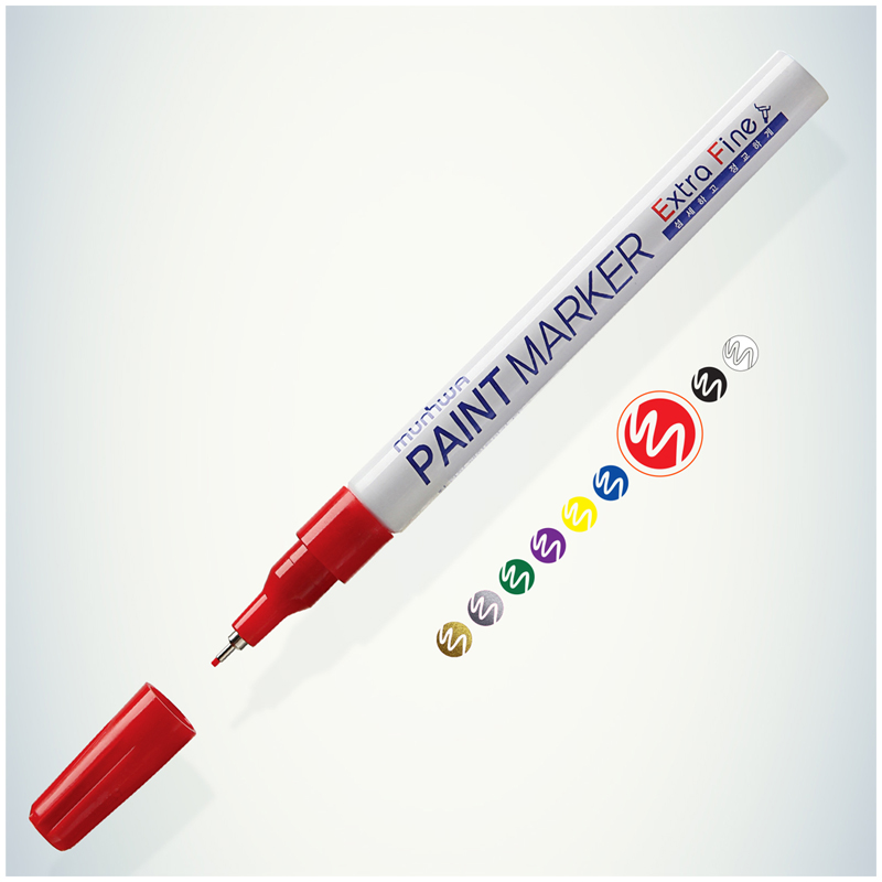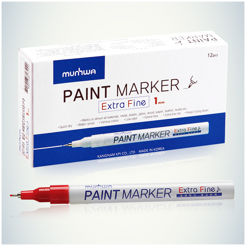 Маркер-краска (лаковый маркер) MunHwa "Extra Fine Paint Marker" - профессиональный лаковый маркер на нитрооснове. <br/>Цвет чернил - красный, диаметр пишущего узла -1 мм. <br/>Маркер-краска MunHwa Extra Fine предназначен для нанесения деликатной маркировки на гладкие поверхности (металл, пластмасса, резина, кожа и пр.). Отлично подходит для маркировки фото пленок и рентгеновских снимков, имеет широкое применения в дизайне, декорировании и оформлении.<br/>Корпус маркера изготовлен из прочного алюминия. Клапанный механизм пишущего узла исключает растекание и разбрызгивание краски, преждевременное пересыхание маркера, срок годности 5 лет.<br/>Благодаря высококачественным чернилам, краска ложится на поверхность равномерным и однородным слоем, полностью закрашивая обрабатываемую поверхность, быстро сохнет. После высыхания, надписи обладают свето и водостойкостью, термостойкостью, устойчивостью к механическим воздействиям.<br/>Инструкция по применению:<br/>1) Встряхнуть маркер с закрытым колпачком.<br/>2) Открыть колпачок. Удерживая маркер в вертикальном положении, несколько раз надавить стержнем на поверхность до тех пор, пока краска не поступит на пишущих узел.<br/>3) Выполнить надпись или рисунок. Дать составу высохнуть в течение 40-60 секунд.<br/>4) Плотно закрыть колпачок.