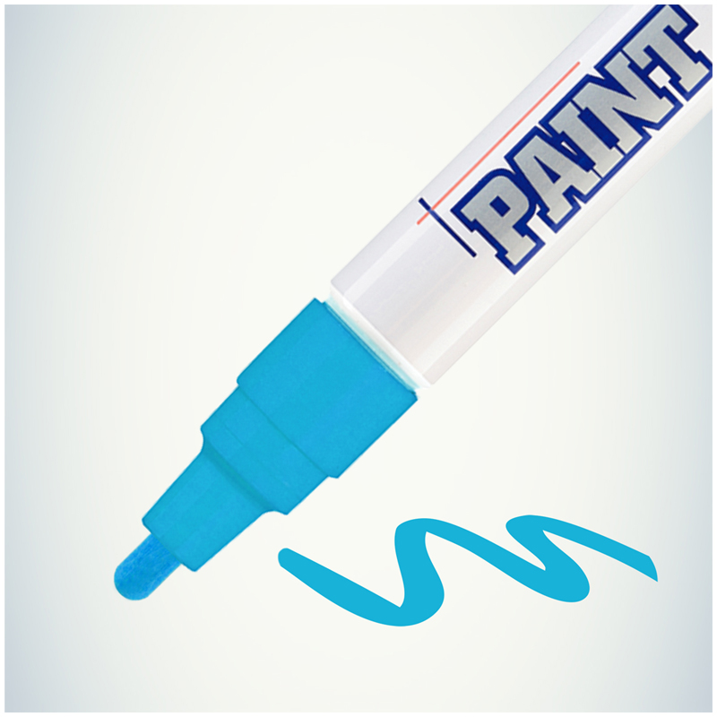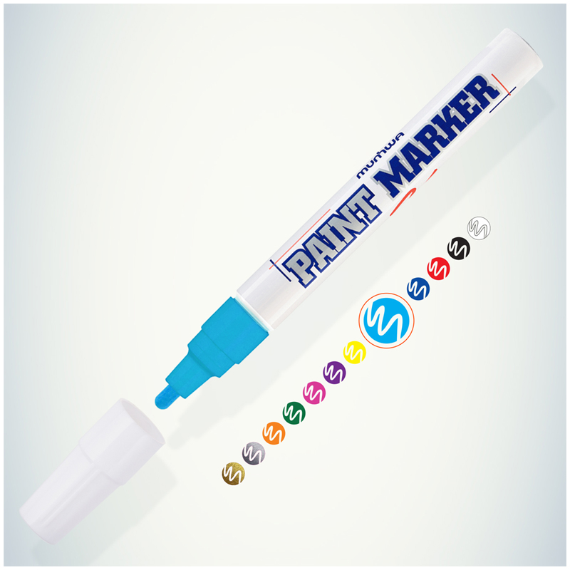 Маркер-краска (лаковый маркер) MunHwa - профессиональный лаковый маркер на нитрооснове. Маркер-краска MunHwa пишет на всех типах поверхностей: металл, дерево, резина, бетон, стекло, кожа. <br/>Цвет чернил - голубой, диаметр пишущего узла - 4 мм. <br/>Paint Marker подходит для реставрации дефектов на бытовой технике, обуви, кузове автомобиля, а также надписей на каменных плитах. Маркер-краска MunHwa имеет широкое применения в дизайне, декорировании и оформлении.<br/>Корпус маркера изготовлен из прочного алюминия. Клапанный механизм пишущего узла исключает растекание и разбрызгивание краски, преждевременное пересыхание маркера, срок годности 5 лет.<br/>Благодаря высококачественным чернилам, краска ложится на поверхность равномерным и однородным слоем, полностью закрашивая обрабатываемую поверхность, быстро сохнет. После высыхания, надписи обладают свето- и водостойкостью, термостойкостью, устойчивостью к механическим воздействиям.<br/>Инструкция по применению:<br/>1) Встряхнуть маркер с закрытым колпачком.<br/>2) Открыть колпачок. Удерживая маркер в вертикальном положении, несколько раз надавить стержнем на поверхность до тех пор, пока краска не поступит на пишущих узел.<br/>3) Выполнить надпись или рисунок. Дать составу высохнуть в течение 40-60 секунд.<br/>4) Плотно закрыть колпачок.