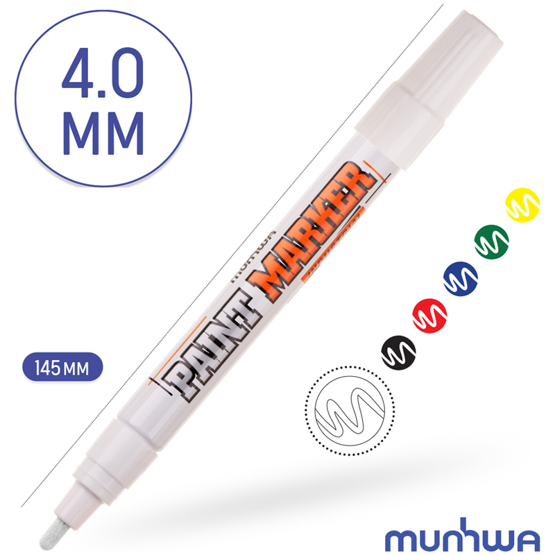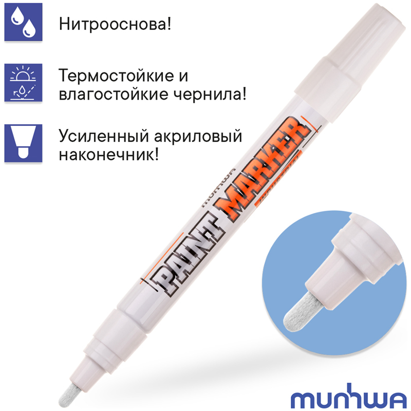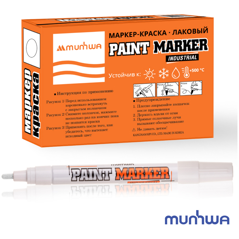 Лаковый маркер-краска MunHwa Industrial – профессиональный инструмент на нитрооснове. Пулевидный наконечник позволяет наносить линии толщиной 2-4 мм. Корпус маркера изготовлен из прочного алюминия, благодаря которому маркер-краска отлично подходит для работы в промышленных условиях. Нитрокраска отличается хорошей адгезией к различным материалам: металл, дерево, резина, бетон, стекло, кожа и др. Краска ложится ярким, плотным слоем и закрашивает поверхность с первого раза.<br/>Водостойкие и термостойкие чернила резистентны к механическим воздействиям. Подходят для нанесения надписей на разогретые до +130°С поверхности.<br/>• Цвет чернил: белый;<br/>• Толщина линии: 4 мм;<br/>• Основа: нитро;<br/>• Форма наконечника: пулевидный.