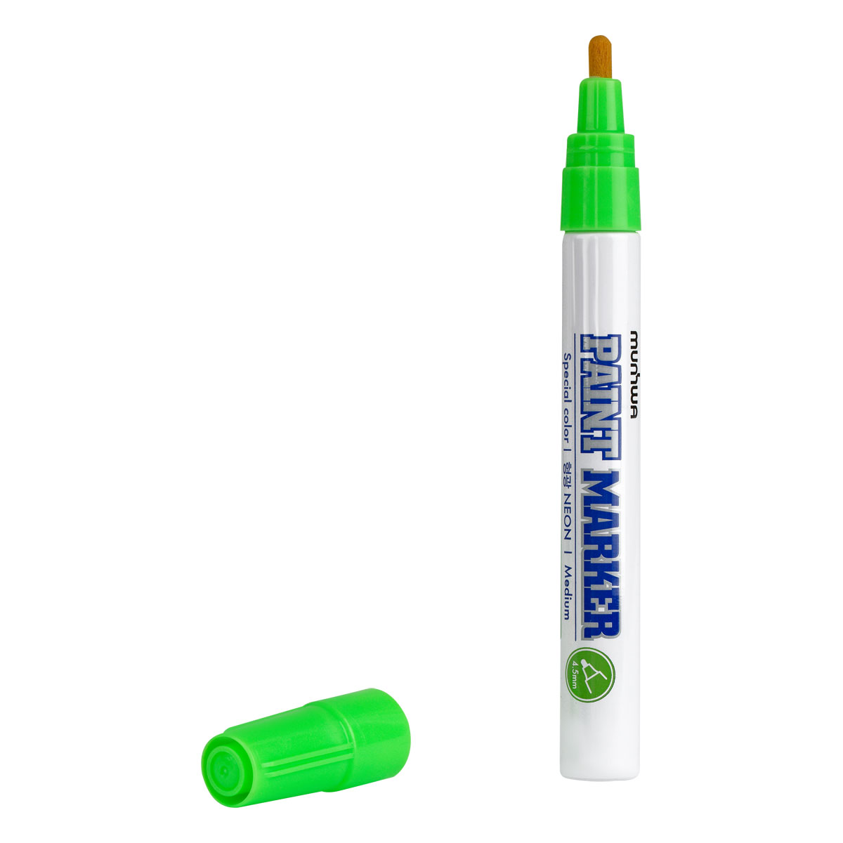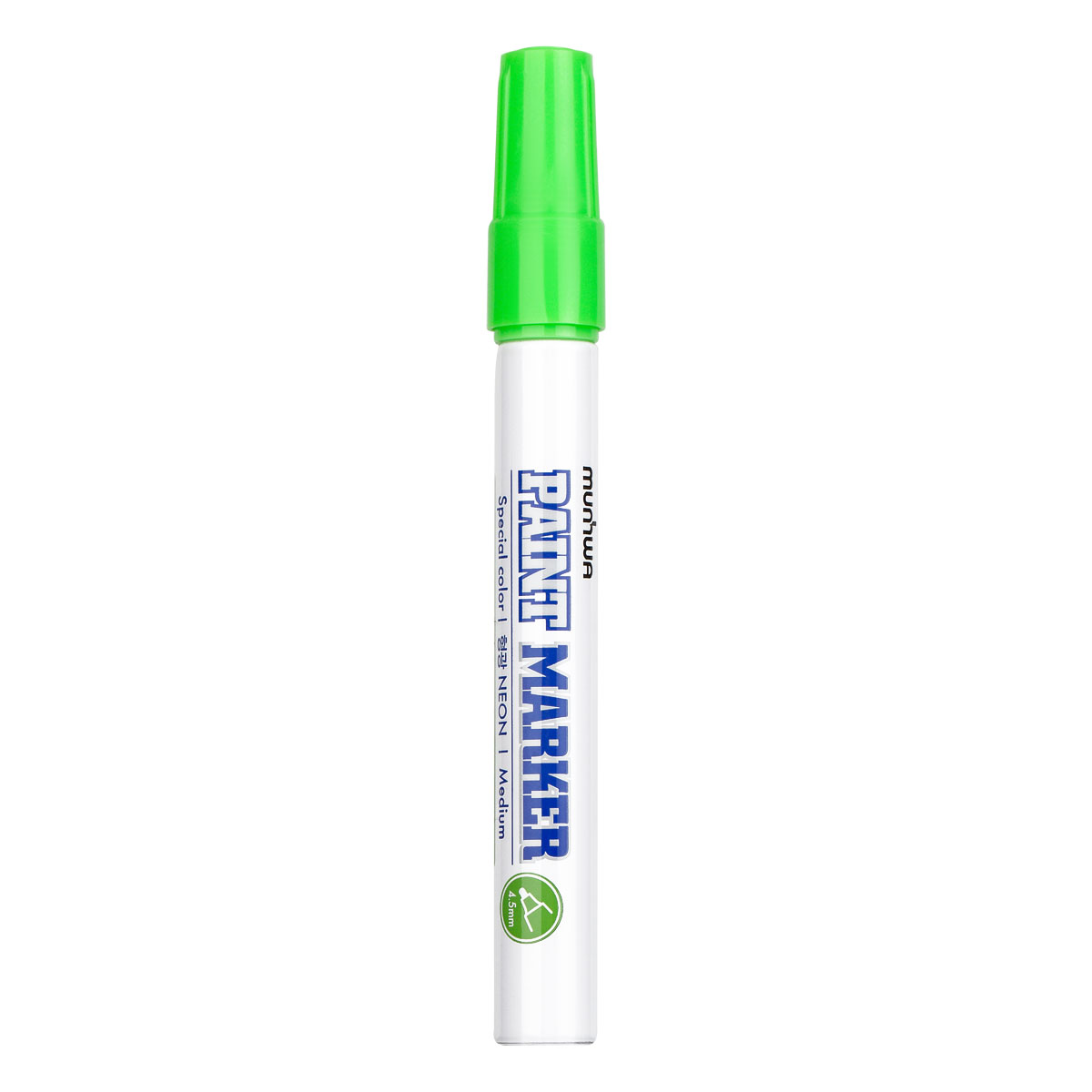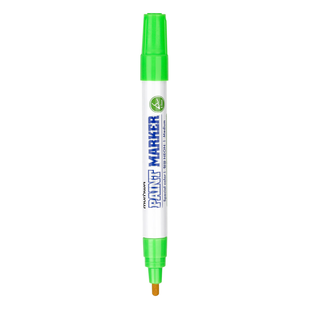 Маркер-краска (лаковый маркер) MunHwa – профессиональный лаковый маркер на нитрооснове. Маркер-краска MunHwa пишет на всех типах поверхностей: металл, дерево, резина, бетон, стекло, кожа. <br/>Цвет чернил – зеленый неон, диаметр пишущего узла – 4,5 мм. <br/>Paint Marker подходит для реставрации дефектов на бытовой технике, обуви, кузове автомобиля, а также надписей на каменных плитах. Маркер-краска MunHwa имеет широкое применения в дизайне, декорировании и оформлении.<br/>Корпус маркера изготовлен из прочного алюминия. Клапанный механизм пишущего узла исключает растекание и разбрызгивание краски, преждевременное пересыхание маркера.<br/>Благодаря высококачественным чернилам, краска ложится на поверхность равномерным и однородным слоем, полностью закрашивая обрабатываемую поверхность, быстро сохнет. После высыхания, надписи обладают свето- и водостойкостью, термостойкостью, устойчивостью к механическим воздействиям.<br/>Инструкция по применению:<br/>1) Встряхнуть маркер с закрытым колпачком.<br/>2) Открыть колпачок. Удерживая маркер в вертикальном положении, несколько раз надавить стержнем на поверхность до тех пор, пока краска не поступит на пишущих узел.<br/>3) Выполнить надпись или рисунок. Дать составу высохнуть в течение 40-60 секунд.<br/>4) Плотно закрыть колпачок.<br/><br/>• Тип: маркер-краска;<br/>• Основа: нитро;<br/>• Диаметр пишущего узла: 4,5 мм;<br/>• Цвет: зелёный.