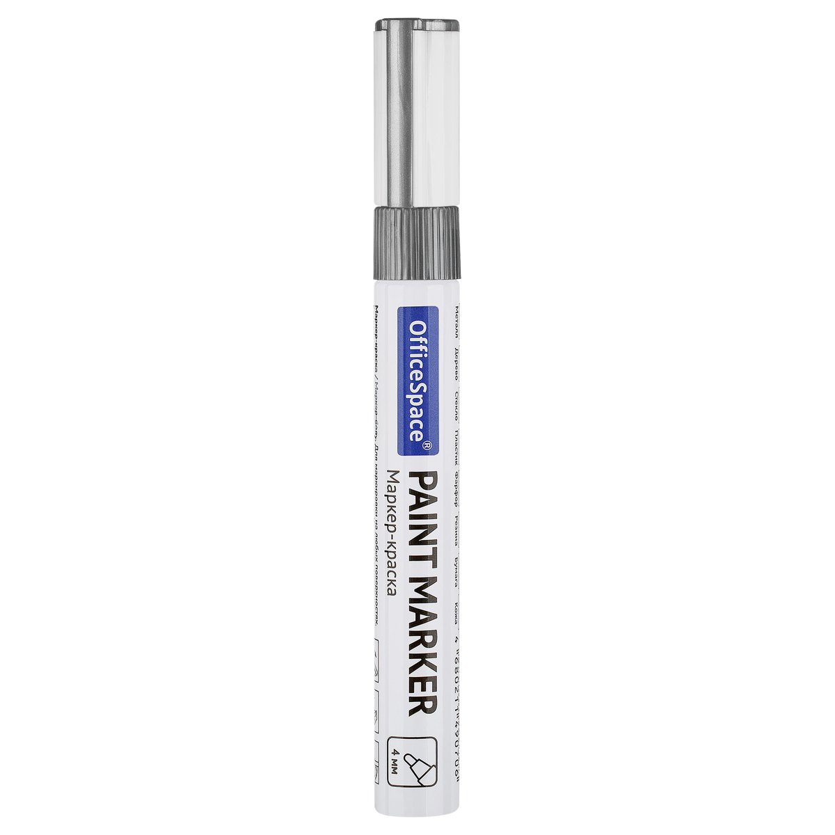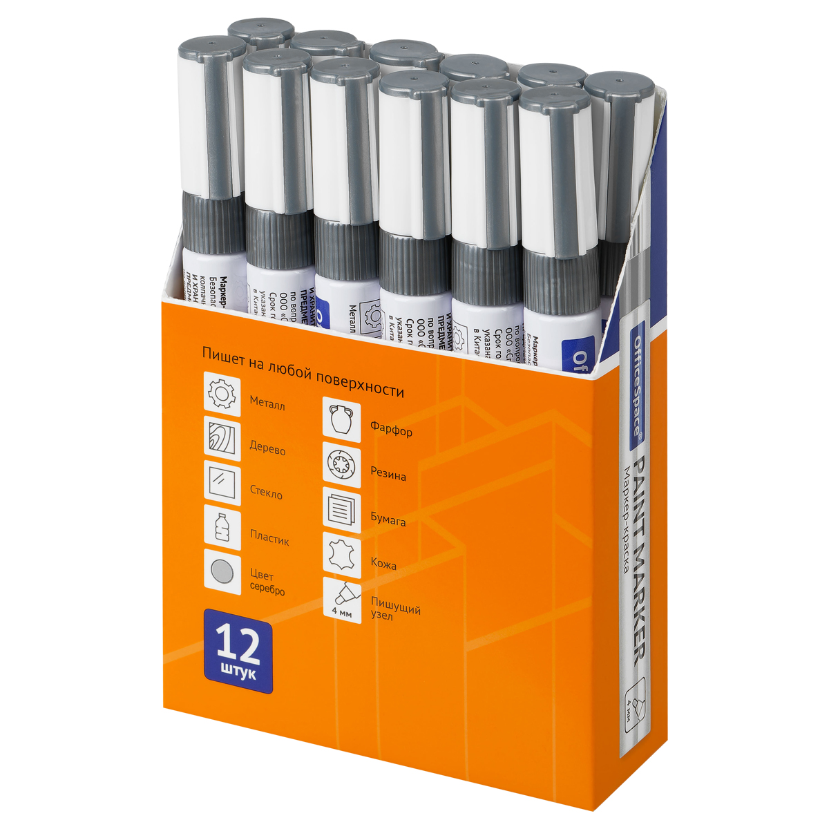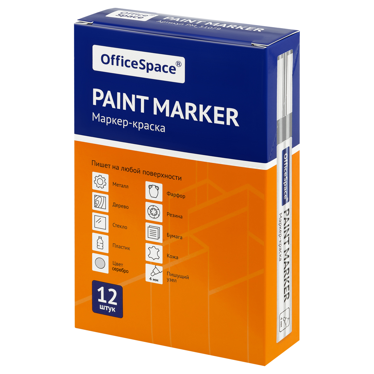 Маркер-краска OfficeSpace с чернилами на нитро-основе подходит для использования на металлических, деревянных, стеклянных и пластиковых поверхностях. Цвет – серебряный. Закругленный пишущий узел оставляет линии шириной 1-4 мм. Длина непрерывной линии – 600 метров. Металлический корпус. Маркеры упакованы по 12 штук в картонную коробку, которую можно использовать в качестве мини-витрины. <br/>• Тип: маркер-краска;<br/>• Основа: нитро;<br/>• Толщина линии: 1-4 мм;<br/>• Цвет: серебряный.