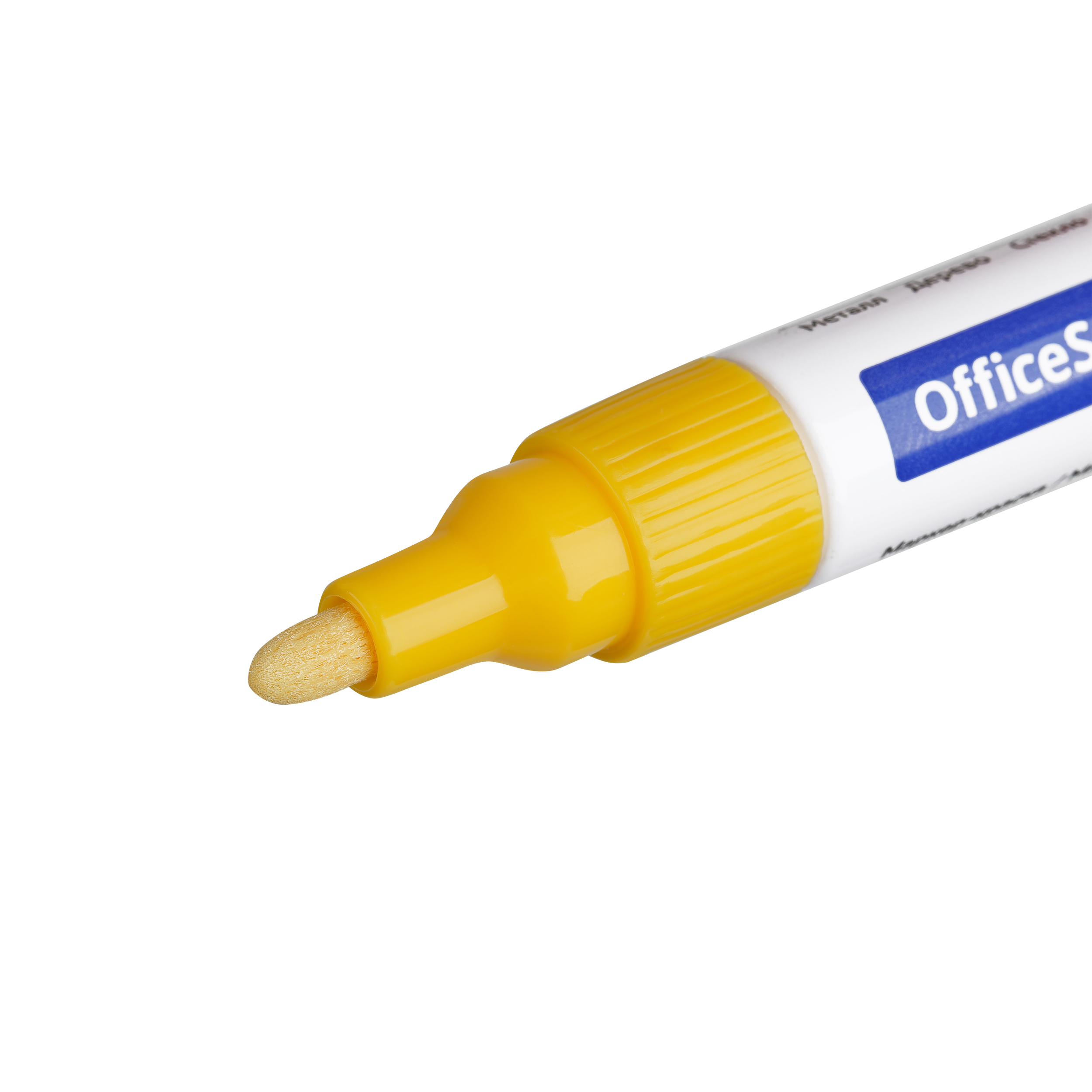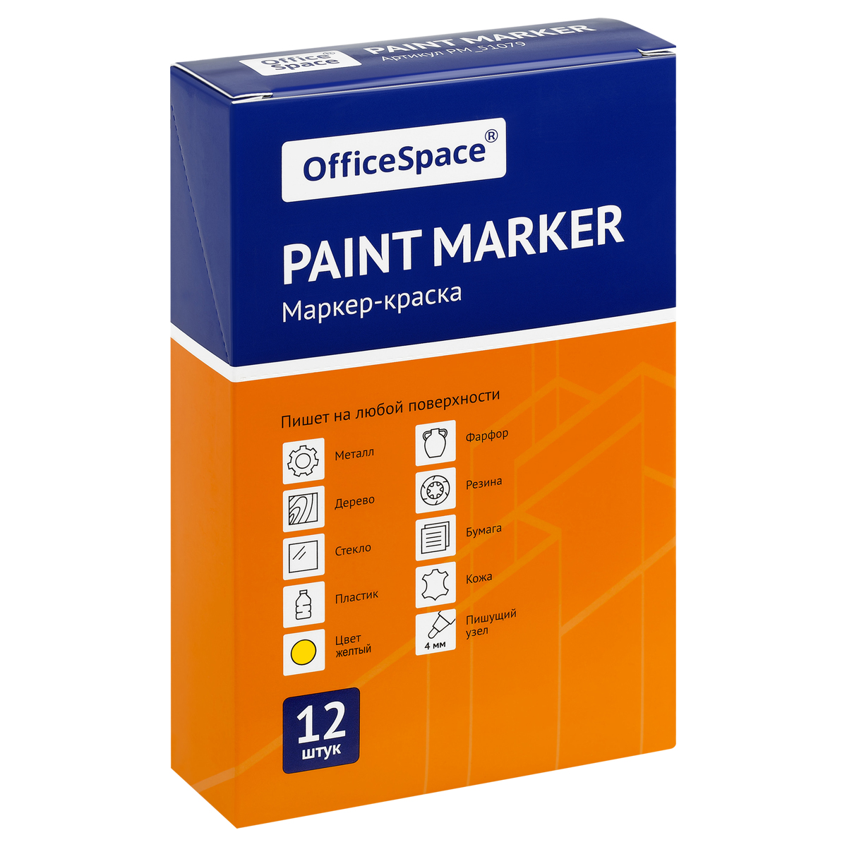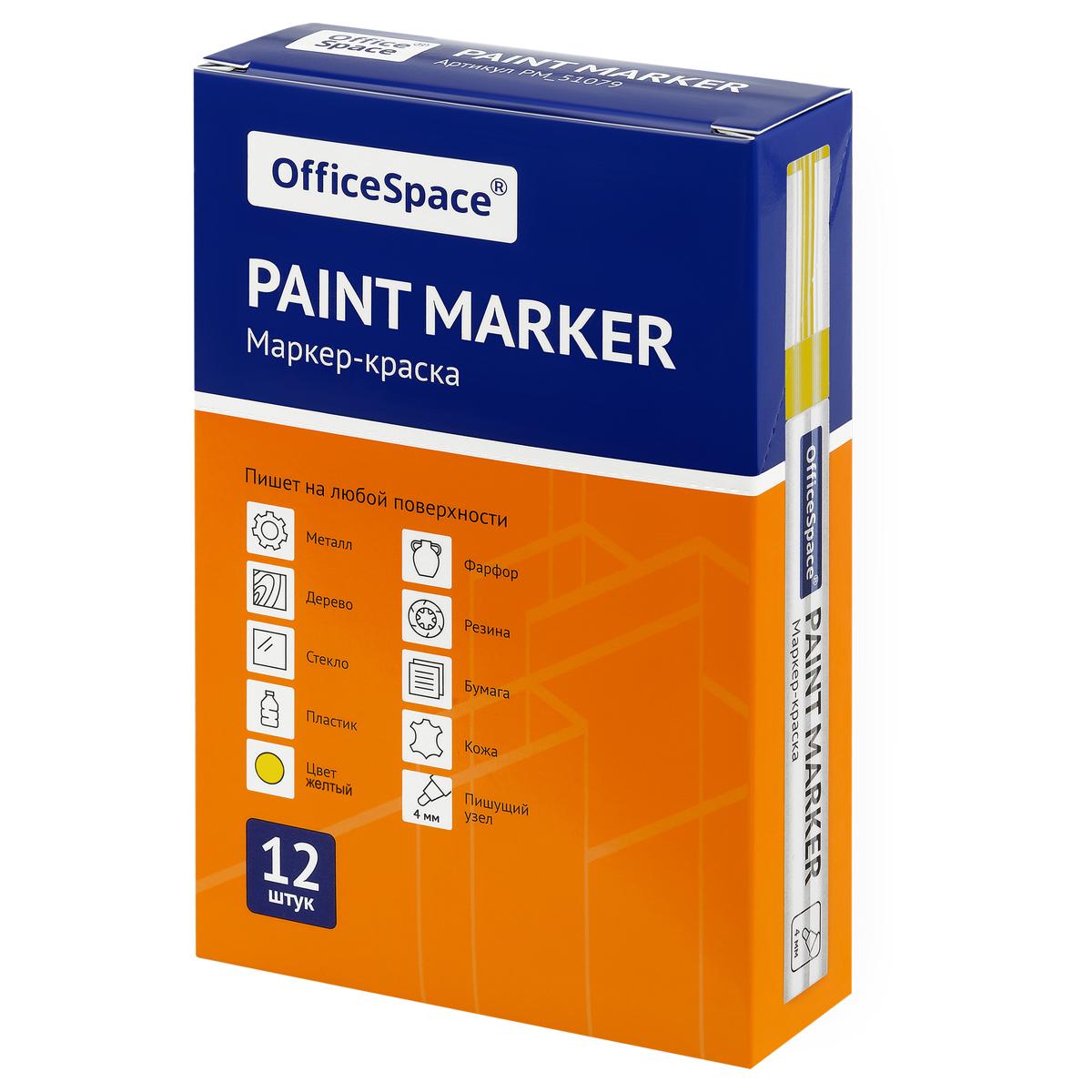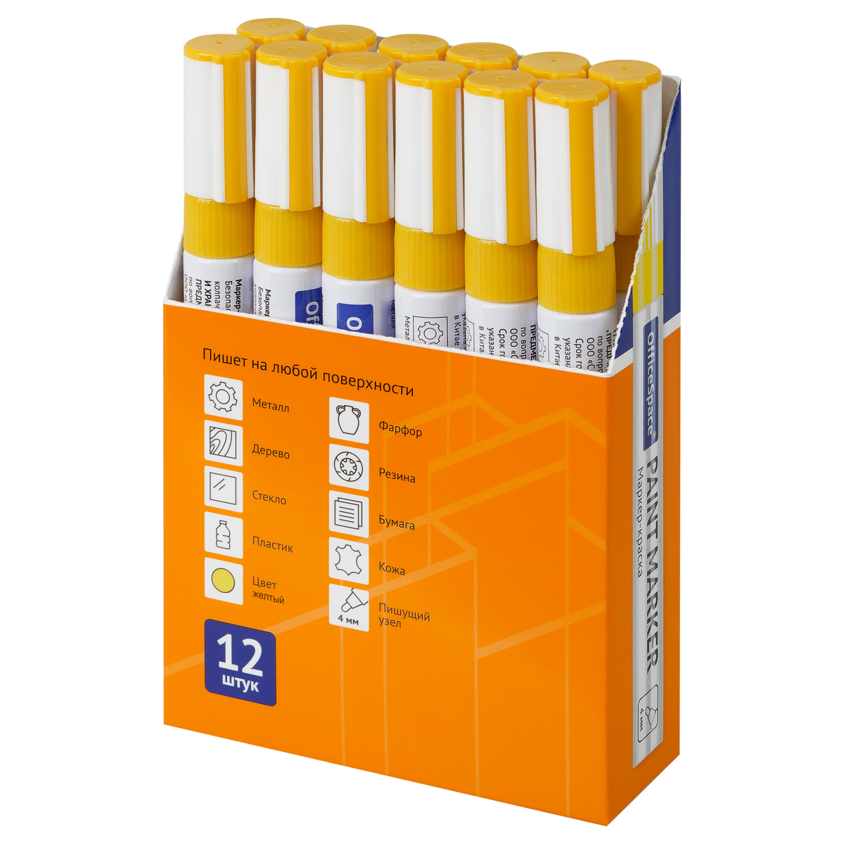 Маркер-краска OfficeSpace с чернилами на нитро-основе подходит для использования на металлических, деревянных, стеклянных и пластиковых поверхностях. Цвет – жёлтый. Закругленный пишущий узел оставляет линии шириной 1-4 мм. Длина непрерывной линии – 600 метров. Металлический корпус. Маркеры упакованы по 12 штук в картонную коробку, которую можно использовать в качестве мини-витрины.