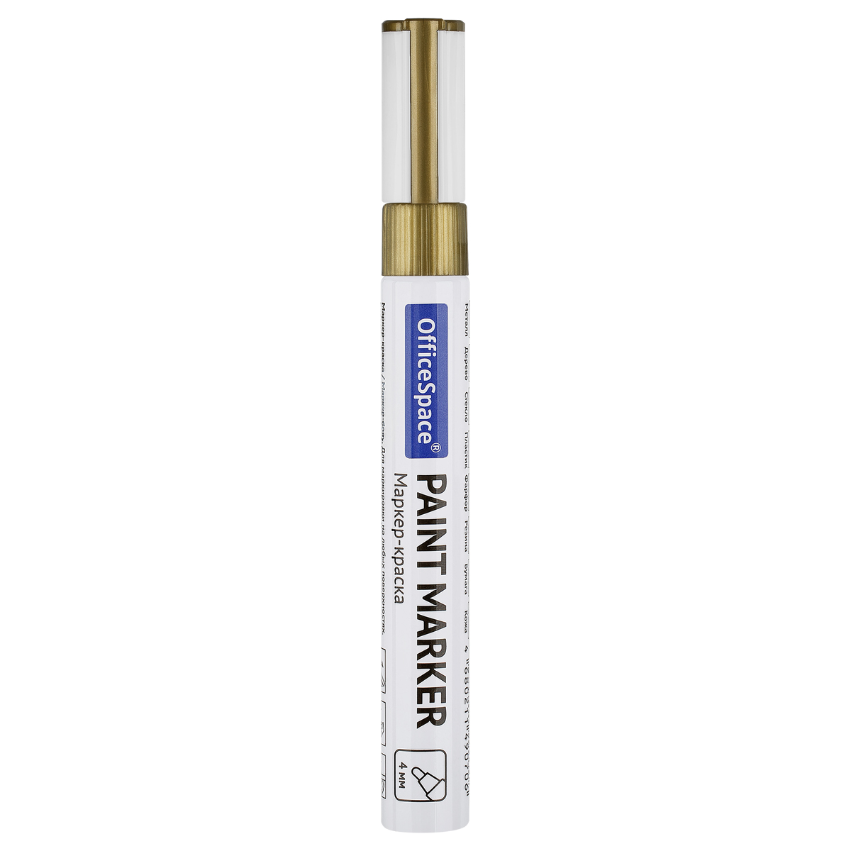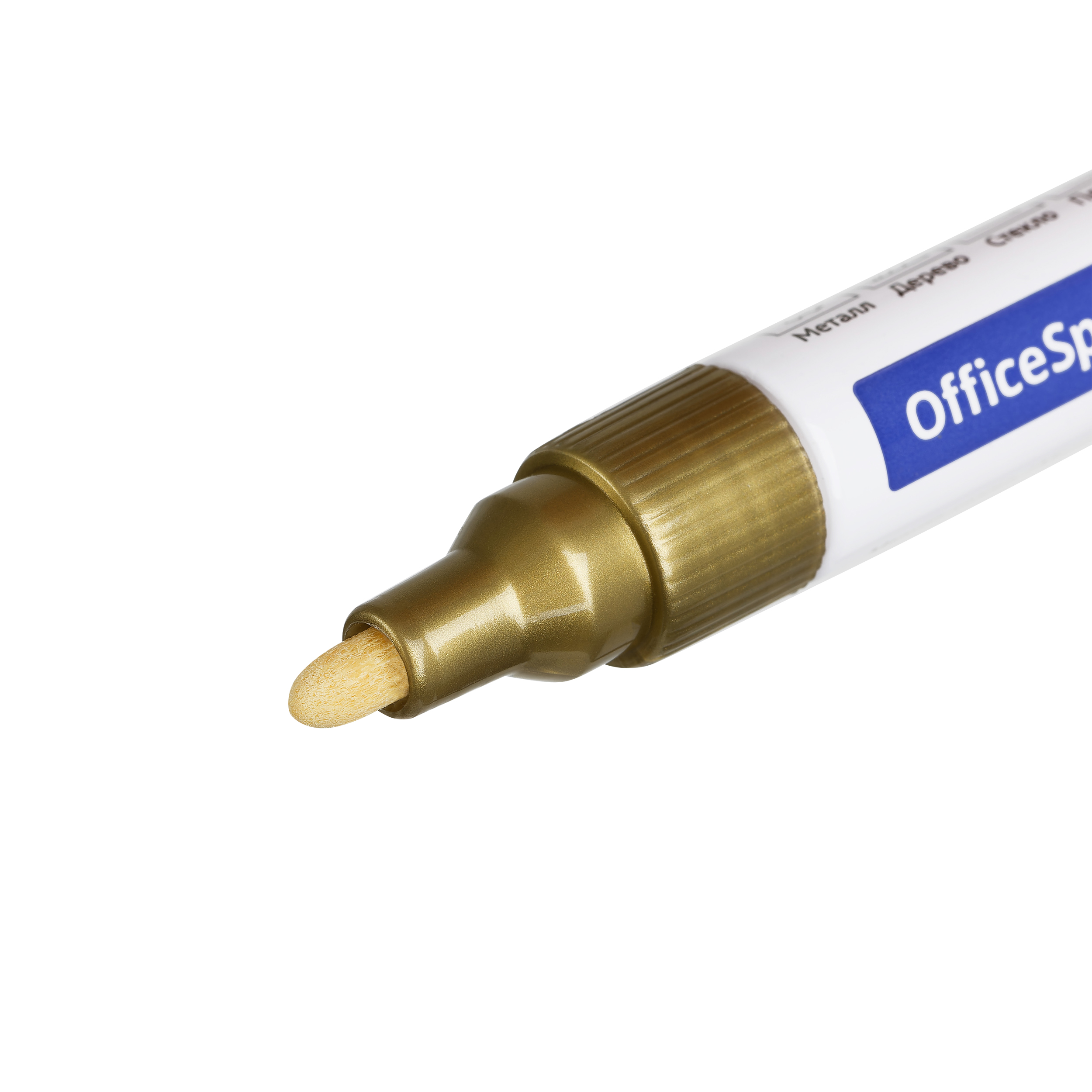 Маркер-краска OfficeSpace с чернилами на нитро-основе подходит для использования на металлических, деревянных, стеклянных и пластиковых поверхностях. Цвет – золотой. Закругленный пишущий узел оставляет линии шириной 1-4 мм. Длина непрерывной линии – 600 метров. Металлический корпус. Маркеры упакованы по 12 штук в картонную коробку, которую можно использовать в качестве мини-витрины. <br/>• Тип: маркер-краска;<br/>• Основа: нитро;<br/>• Толщина линии: 1-4 мм;<br/>• Цвет: золотой.