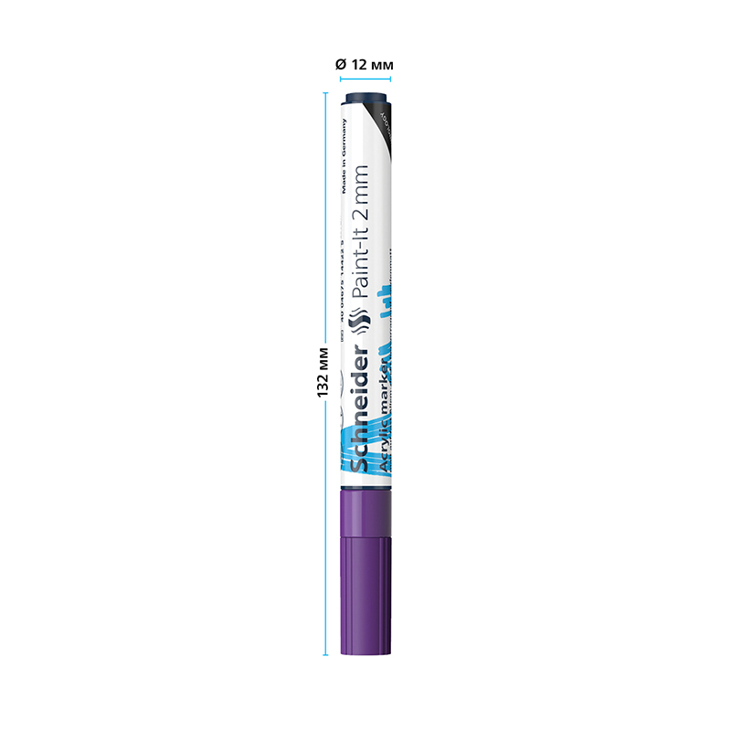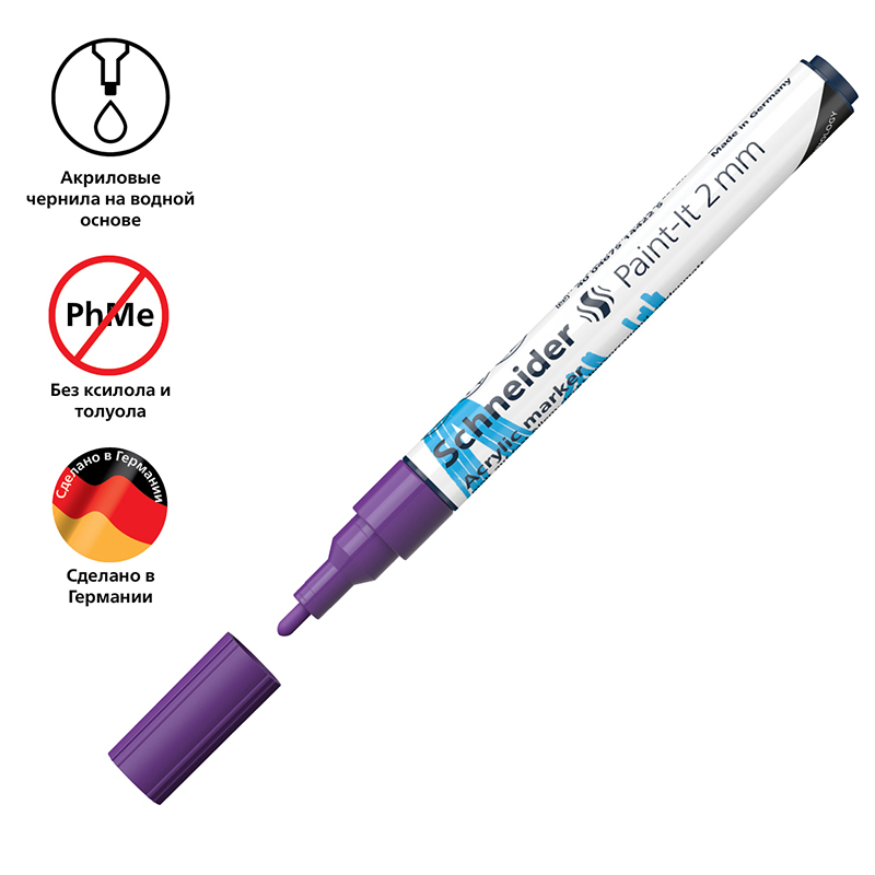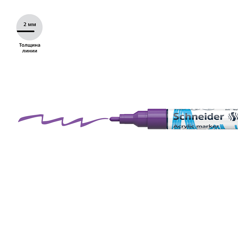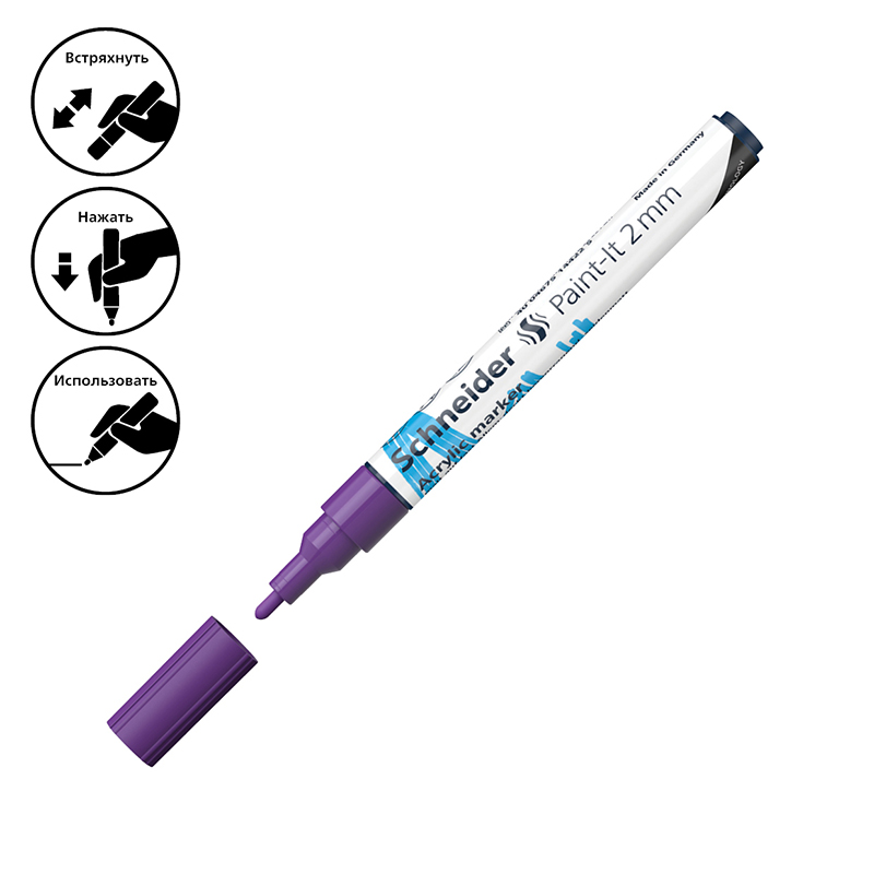 Schneider Paint-It 310 - акриловый маркер для творчества и хобби. Толщина линии – 2 мм, форма наконечника – пулевидная, цвет чернил - фиолетовый. Акриловые чернила на водной основе быстро сохнут, обеспечивают интенсивность цвета, высокие укрывные свойства и стойкость после высыхания. Не содержат ксилол и толуол. Подходит для работ на различных поверхностях: бумага, дерево, камень, гипс и т.д. Перед использованием маркер необходимо встряхнуть для смешивания и равномерной подачи чернил. <br/>• Цвет чернил: фиолетовый;<br/>• Толщина линии письма: 2 мм;<br/>• Страна производства: Германия