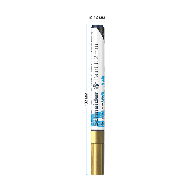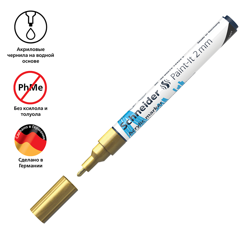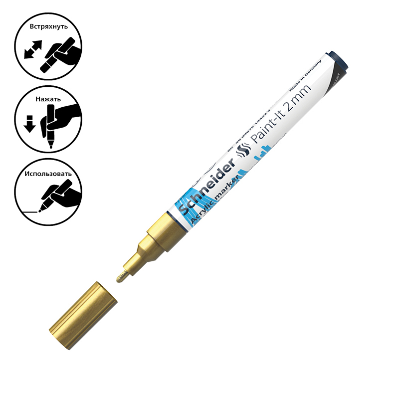Schneider Paint-It 310 - акриловый маркер для творчества и хобби. Толщина линии – 2 мм, форма наконечника – пулевидная, цвет чернил - золотой. Акриловые чернила на водной основе быстро сохнут, обеспечивают интенсивность цвета, высокие укрывные свойства и стойкость после высыхания. Не содержат ксилол и толуол. Подходит для работ на различных поверхностях: бумага, дерево, камень, гипс и т.д. Перед использованием маркер необходимо встряхнуть для смешивания и равномерной подачи чернил. <br/>• Цвет чернил: золотой;<br/>• Толщина линии письма: 2 мм;<br/>• Страна производства: Германия