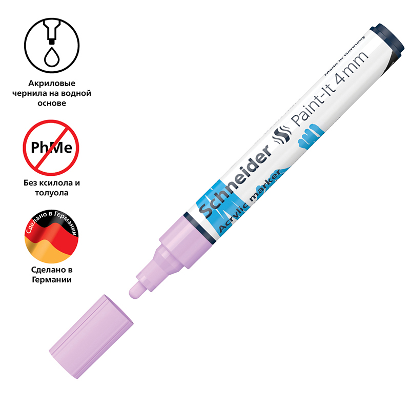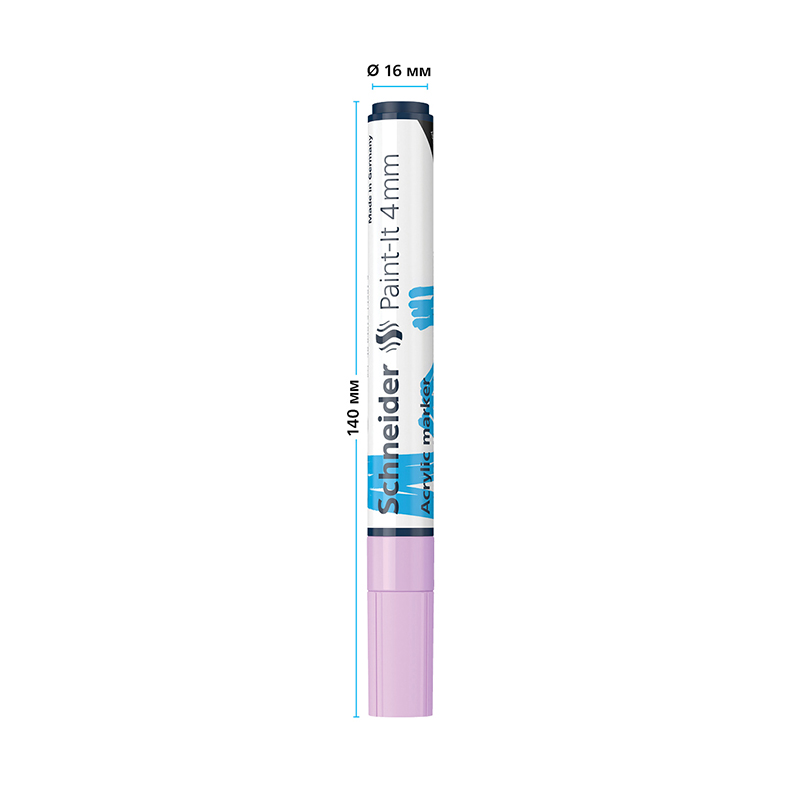 Schneider Paint-It 320 - акриловый маркер для творчества и хобби. Толщина линии – 4 мм, форма наконечника – пулевидная, цвет чернил - пастельный сиреневый. Акриловые чернила на водной основе быстро сохнут, обеспечивают интенсивность цвета, высокие укрывные свойства и стойкость после высыхания. Не содержат ксилол и толуол. Подходит для работ на различных поверхностях: бумага, дерево, камень, гипс и т.д. Перед использованием маркер необходимо встряхнуть для смешивания и равномерной подачи чернил. <br/>• Цвет чернил: пастельный сиреневый;<br/>• Толщина линии письма: 4 мм;<br/>• Страна производства: Германия