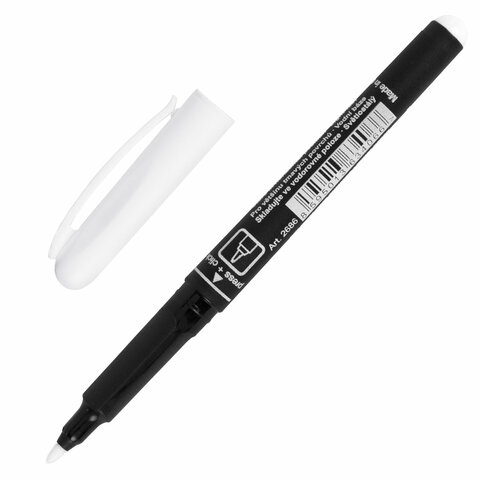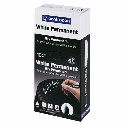 Универсальный белый маркер пишет на большинстве поверхностей, после засыхания устойчив к воде, стиранию, атмосферным воздействиям. Чернила на водной основе, перманентные, светостойкие. Толщина линии - 1,2 мм.