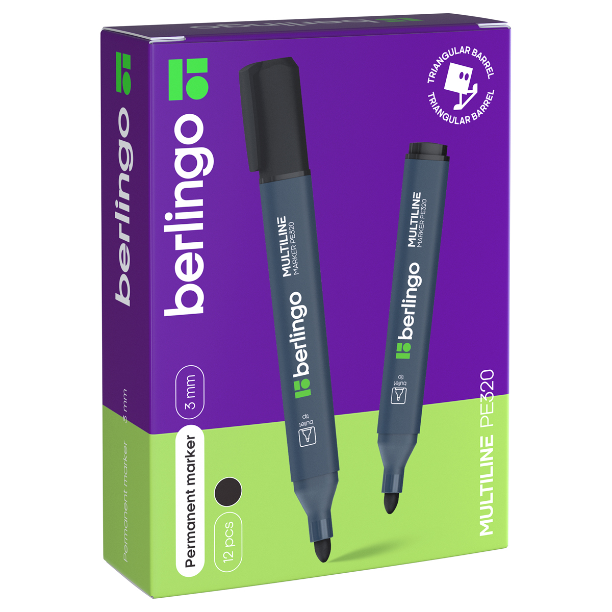 Перманентные маркеры Berlingo Multiline PE320 идеальны для надежной и комфортной маркировки большинства материалов, включая металл, дерево, пластик, стекло. Благодаря матовому покрытию и трехгранному корпусу маркеры прекрасно лежат в руке. <br/>Чернила Dokumental обеспечивают дополнительную адгезию и быстрое высыхание на поверхности, что позволяет использовать их даже на непористых поверхностях. Краска также обладает повышенной светостойкостью. <br/>Наконечник пулевидной формы выполнен из износостойкого акрила, который не теряет форму под давлением даже после длительного времени использования.<br/>Продукт не содержит токсичных веществ - ксилол или толуол и подходит для использования в офисе и дома.<br/>Упакованы в коробочку по 12 штук.
