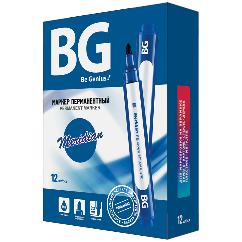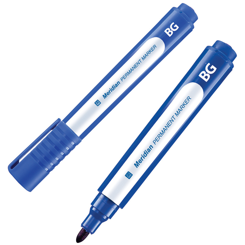 Маркер перманентный BG Merodian с чернилами синего цвета на спиртовой основе предназначен для письма на большинстве твёрдых поверхностей, включая картон, бумагу, металл, стекло, дерево и пластик. Круглый корпус маркера диаметром 10 мм выполнен из пластика. Маркер представлен с пулевидным наконечником, толщина линии составляет 2-3 мм. <br/>• цвет чернил: синий;<br/>• тип наконечника: пулевидный;<br/>• толщина линии письма: 2-3 мм;<br/>• основа чернил: спиртовая.