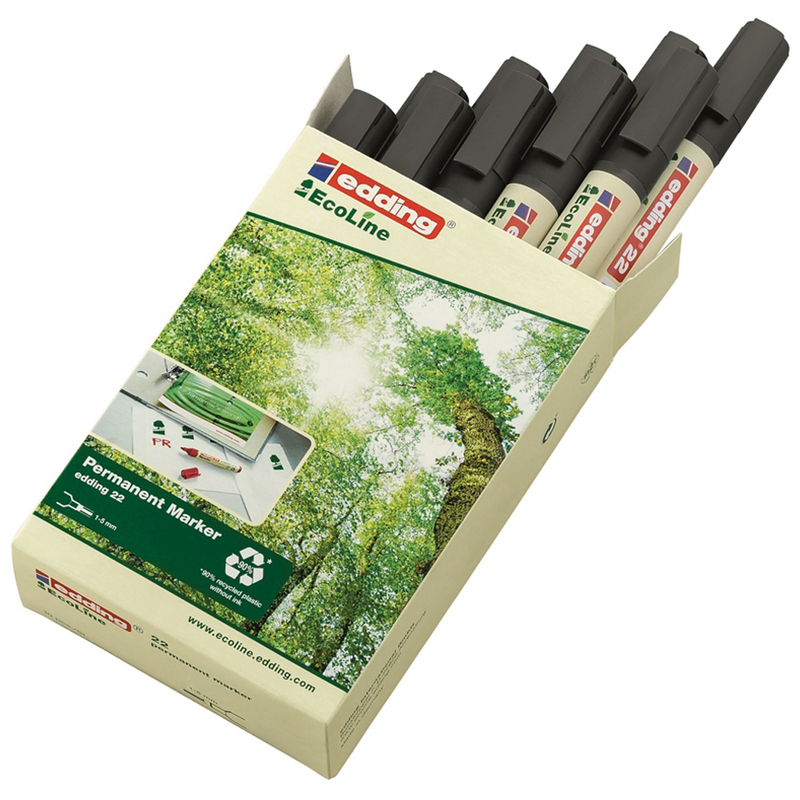 Перманентный маркер Edding Eco E-22/1 в эргономичном пластиковом корпусе минимум на 90% изготовлен из возобновляемого сырья. Быстросохнущие нестираемые чернила на спиртовой основе без добавления толуола и ксилола почти не имеют запаха, устойчивы к истиранию, свету и воде. Идеально подходит для надписей на металле (в том числе и на грязном), картоне. Может использоваться для таких поверхностей, как дерево (в том числе влажное), стекло, пластик, керамика, кафель, различные пленки. Наконечник клиновидной формы обеспечивает толщину линии от 1 до 5 мм. Edding ECO E-22/1 является заправляемым. Страна производства — Германия. Цвет — черный. Серия Eco — с заботой о природе: экологичность обеспечивается использованием переработанных материалов при производстве и сокращенным расходом чернил (замена маркера происходит редко).