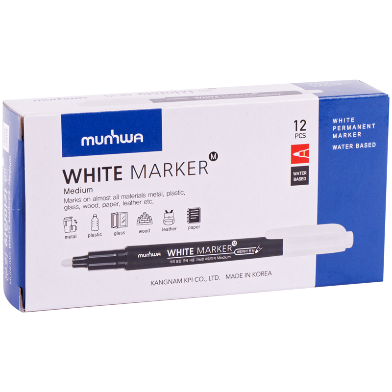 Устойчивый маркер с чернилами белого цвета отлично подходит для нанесения маркировки на большинство поверхностей: метал, стекло, пластик, дерево, бумага и т.д. Чернила обладают высокой светостойкостью, укрывистостью, непрозрачны, оставляют плотный яркий след. Пишущий состав на водной основе обеспечивает максимальную безопасность (не содержат ксилол и толуол). Время высыхания 15 секунд (зависит от типа поверхности). Длина непрерывной линии 250 метров (зависит от типа поверхности). Вес чернил 1,5 грамма. Диаметр пишущего узла – 2 мм. След от маркеров можно при желании удалить с непористых поверхностей с помощью влажной абразивной губки или смоченной в спиртовом составе салфетки. Маркеры являются устойчивыми и не предназначены для нанесения временной легко-стираемой маркировки