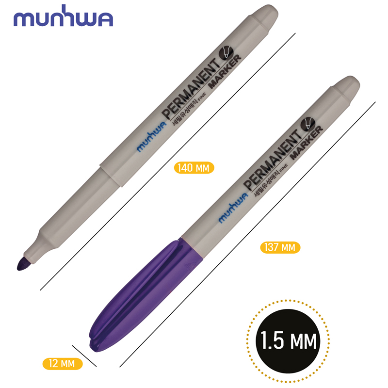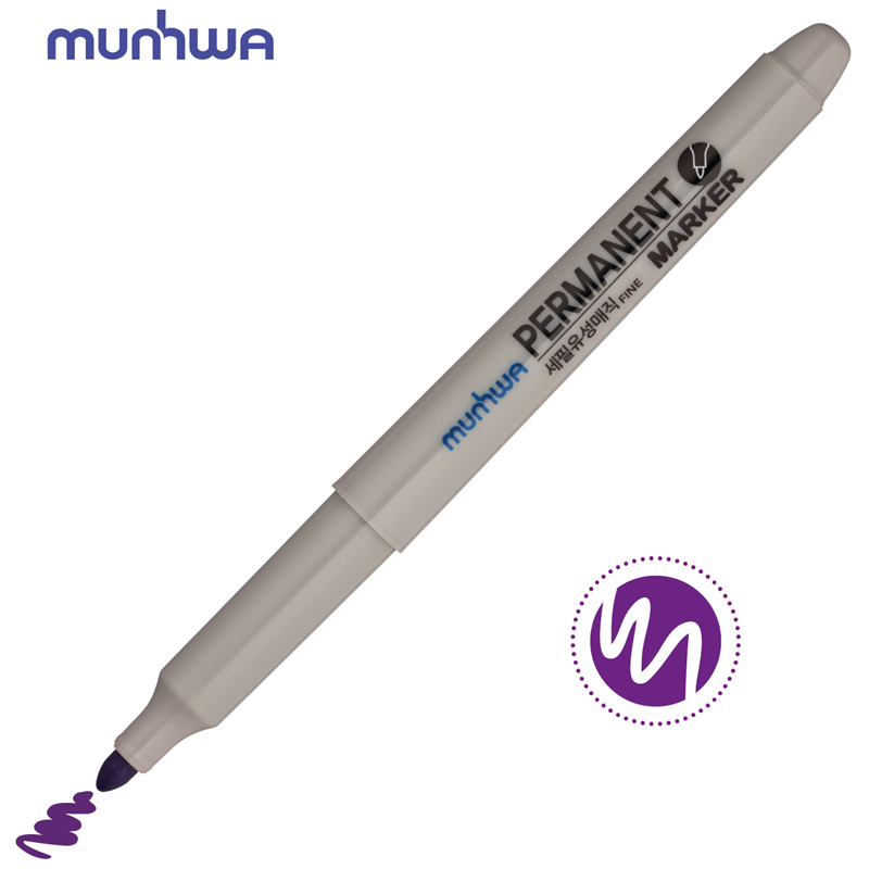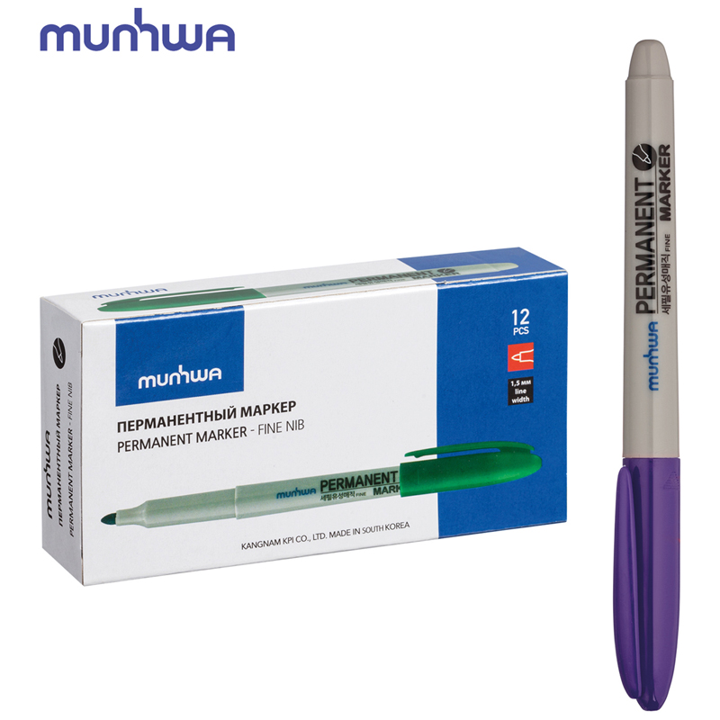 Перманентный маркер MunHwa - деликатная маркировка на всех типах поверхностей: резина, дерево, металл, пластик, ПВХ, бетон, кирпич, плитка, стекло, керамика, картон, текстиль, кожа.<br/>Круглый пишущий узел из акрила создает линии толщиной 1,5-2 мм. Яркий и насыщенный цвет чернил. Чернила на спиртовой основе. Цвет чернил - фиолетовый. Упаковка: картонная коробка по 12 штук. <br/>Корпус маркера изготовлен из прочного пластика эргономичной формы. Цвет колпачка соответствует цвету чернил.<br/>Чернила устойчивы к климатическим изменения (дождь, туман, солнце), не стираются и не выцветают в течение длительного времени (до 3-х лет в зависимости от эксплуатации промаркированного изделия), оставляют четкую и однородную линию, безопасны для использования и не содержат ксилол и толуол.