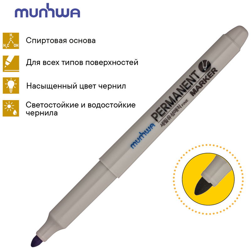 Перманентный маркер MunHwa - деликатная маркировка на всех типах поверхностей: резина, дерево, металл, пластик, ПВХ, бетон, кирпич, плитка, стекло, керамика, картон, текстиль, кожа.