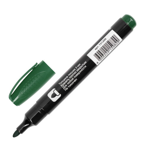 Маркер перманентный зеленого цвета обладает круглой формой корпуса из пластика, диаметр которого 15 мм. Толщина линии письма - 2,5-4 мм в зависимости от угла наклона. Особая нестираемая основа перманентного маркера обеспечивает такие качества, как стойкость к воздействию воды, ультрафиолету, низких и высоких температур. Благодаря спиртовой основе чернила быстро сохнут и не размазываются. Износостойкий фетровый наконечник устойчив к повреждениям и обеспечивает экономный расход чернил. Изделие не перезаправляется. Плотно закрывается колпачком, что предотвращает высыхание наконечника и чернил. Цвет колпачка соответствует цвету чернил.