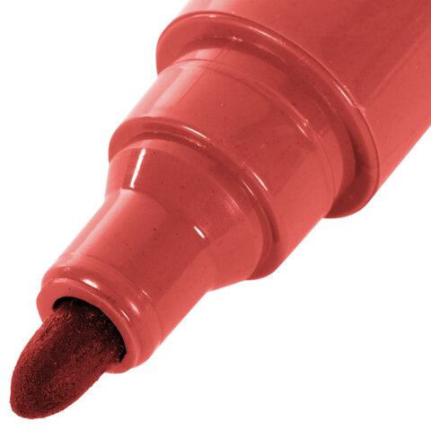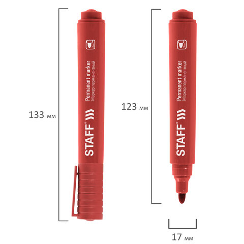 Маркер перманентный красного цвета обладает круглым корпусом, диаметр которого 17 мм и длина 133 мм. Толщина линии письма - 3 мм. Особая нестираемая основа перманентного маркера обеспечивает такие качества, как стойкость к воздействию воды, низких и высоких температур. Благодаря спиртовой основе чернила быстро сохнут и не размазываются. Износостойкий наконечник устойчив к повреждениям и обеспечивает экономный расход чернил. Изделие не перезаправляется. Плотный колпачок с клипом предотвращает высыхание наконечника и чернил. Цвет корпуса и колпачка соответствует цвету чернил.