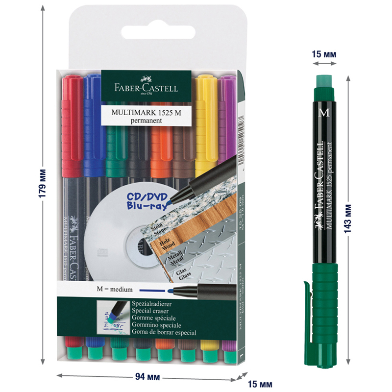 Универсальные перманентные маркеры Multimark permanent M от легендарного немецкого производителя Faber-Castell. Диаметр пишущего узла составляет 1 мм, толщина линии письма - 1 мм. Изделия идеально подходят для дерева, металла, стекла, пластика и картона. Чернила также устойчивы к морозу. Изделия имеют прочный колпачок, который защищает пулевидный прочный наконечник диаметром 1 мм от деформации. Специальный встроенный ластик способен полностью удалять линии написанные маркером практически со всех гладких поверхностей. Круглая форма корпуса добавляет удобства при работе с изделиями. Набор состоит из 8 цветов: красного, чёрного, зелёного, синего, оранжевого, коричневого, жёлтого, фиолетового. Все маркеры упакованы в пластиковый чехол.
