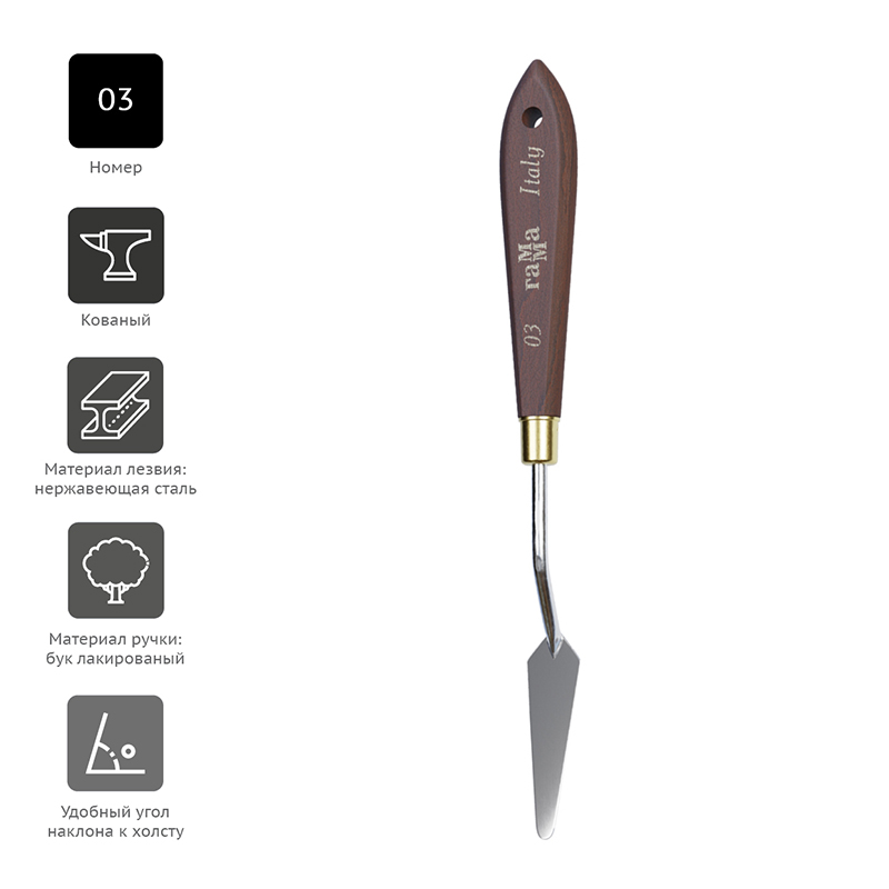 Мастихины серии «Старый Мастер» изготовлены вручную в Италии. Лезвие из нержавеющей стали прочное и упругое. Лезвие имеет специальное глянцевое покрытие для долговечной службы. Эргономичная ручка из натурального бука отполирована вручную и оснащена отверстием для хранения на подвесе. Бесшовная обойма гарантирует надежное соединение лезвия и ручки. Коллекция мастихинов представлена в 12 самых популярных видах лезвий: ромб, капля, «рыбка», овальное, прямоугольные.