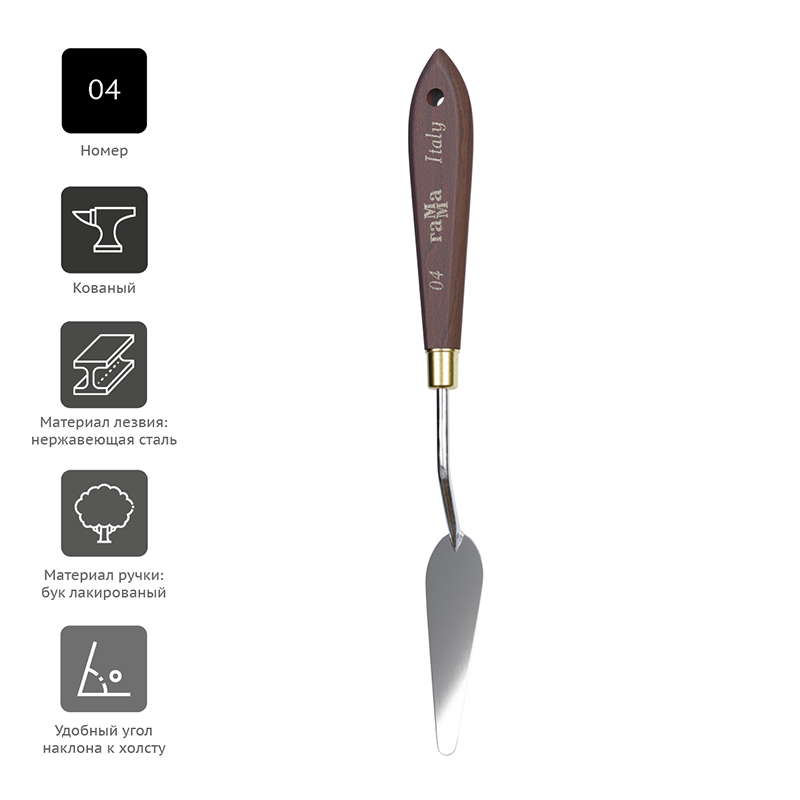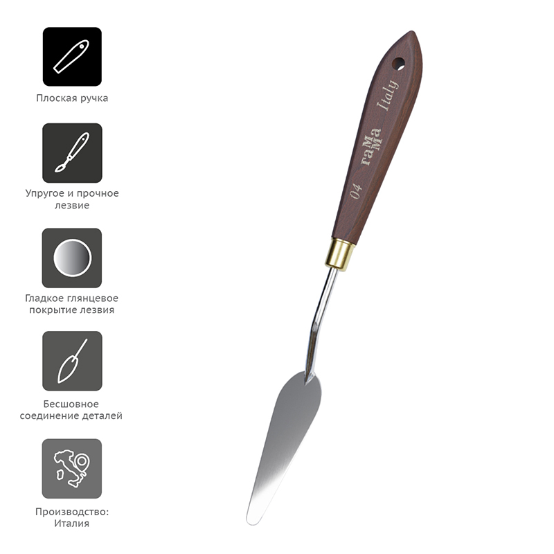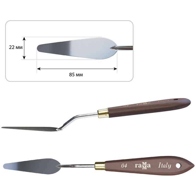 Мастихины серии «Старый Мастер» изготовлены вручную в Италии. Лезвие из нержавеющей стали прочное и упругое. Лезвие имеет специальное глянцевое покрытие для долговечной службы. Эргономичная ручка из натурального бука отполирована вручную и оснащена отверстием для хранения на подвесе. Бесшовная обойма гарантирует надежное соединение лезвия и ручки. Коллекция мастихинов представлена в 12 самых популярных видах лезвий: ромб, капля, «рыбка», овальное, прямоугольные.
