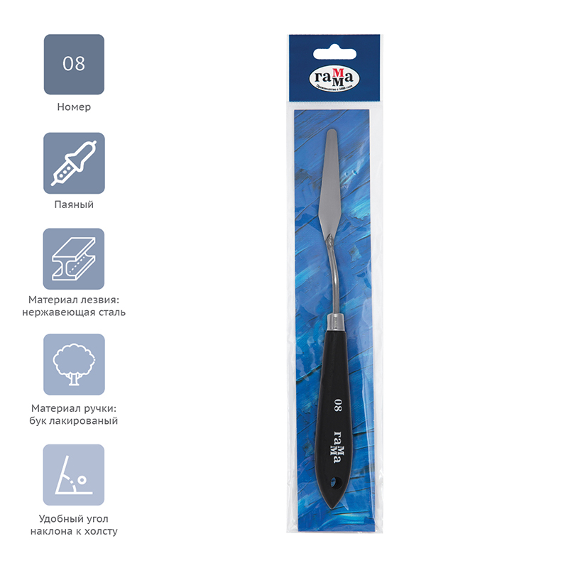 Паяный мастихин из нержавеющей стали с удобной плоской ручкой из натурального бука. Сварное соединение ручки и лезвия дает больший угол наклона мастихина к холсту, снижая вероятность случайного касания и смазывания краски.