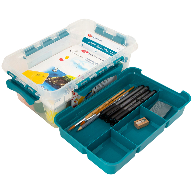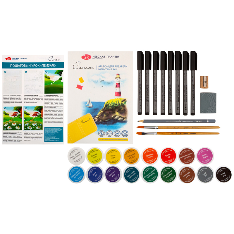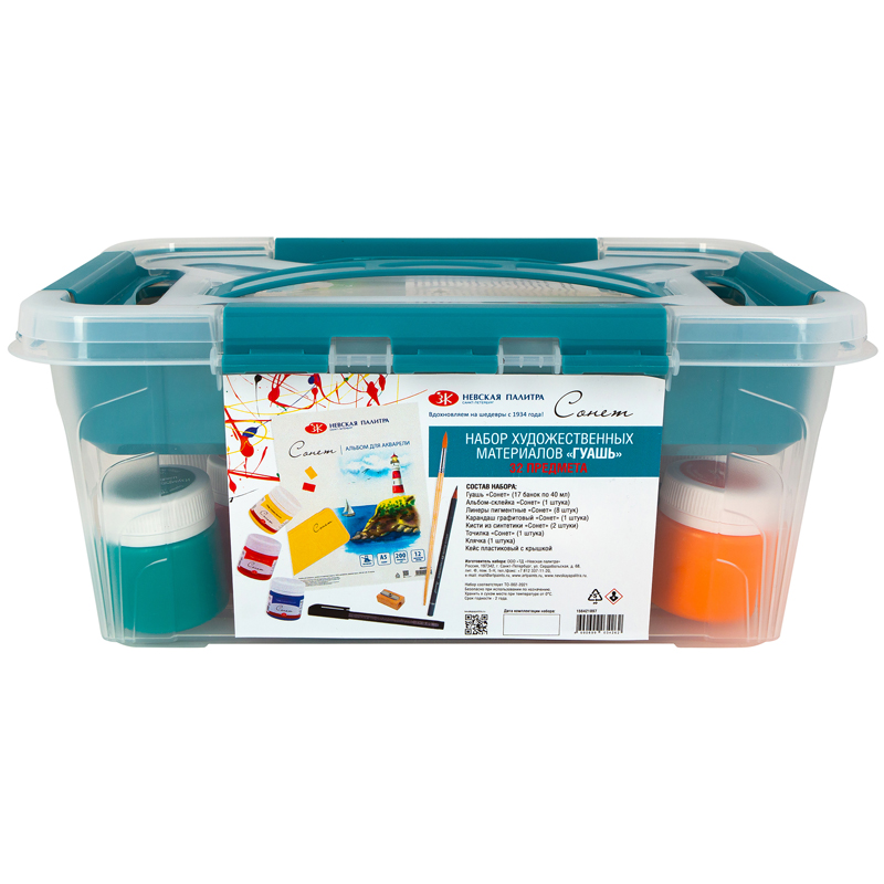 Набор художественных материалов Сонет, 32 предмета. В состав набора входят: гуашь "Сонет" - 17 банок по 40мл., альбом на склейке - 1шт.,, линеры пигментные - 8 штук, карандаш графитовый - 1шт., кисти из синтетики - 2шт., точилка - 1шт., ластик-клячка - 1шт., кейс пластиковый с крышкой. Размер кейса 290*190*124мм.