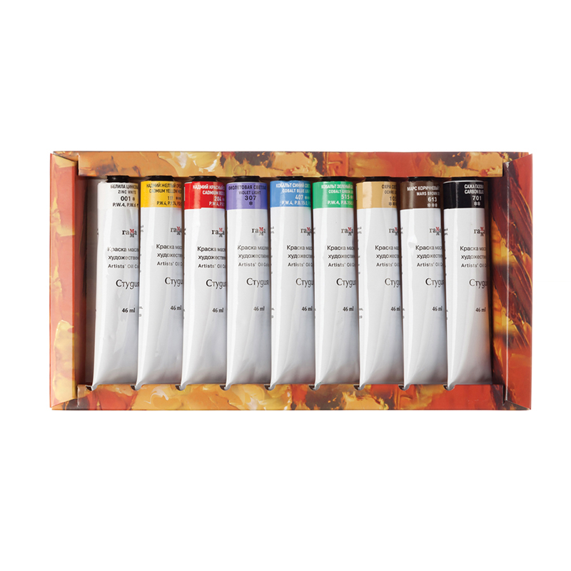 Масляные краски серии «Студия» не уступают тонкотёртым масляным краскам по степени перетира, пастозности и светостойкости. Краски экологически безопасны благодаря имитациям кадмиево-кобальтовой группы пигментов. Они идеальны для начинающих художников и студентов художественных училищ. В набор входят 9 цветов в аллюминиевых тубах: белила цинковые, кадмий жёлтый, кадмий красный светлый (имит.), фиолетовый светлый, кобальт синий светлый (имит.), кобальт зелёный светлый (имит.), охра светлая, марс коричнеый тёмный (имит.), сажа газовая. Объём одной тубы — 46 мл, общий объём — 414 мл.