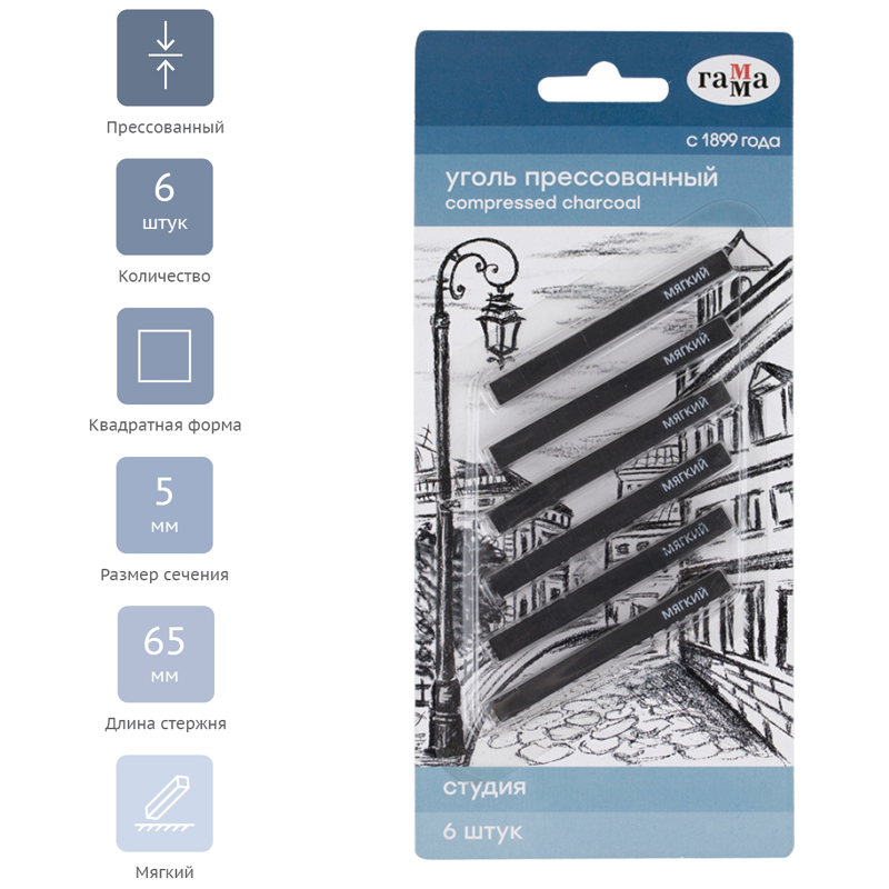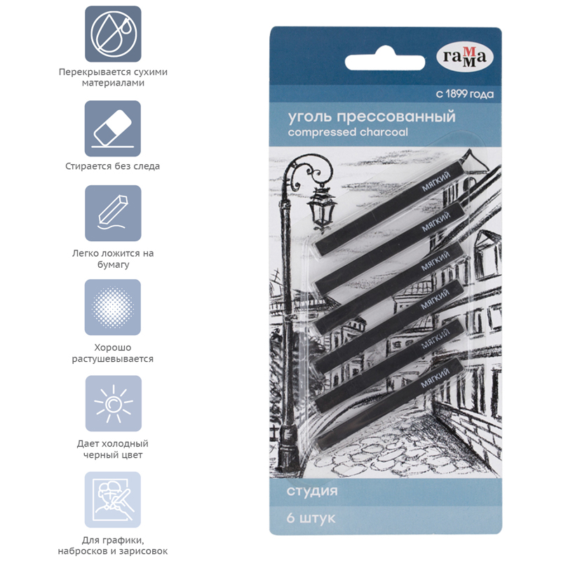 Натуральный уголь для графики, набросков и зарисовок. Деликатный штрих холодного черного цвета. Перекрывается сухими материалами, стирается без следа. Легко ложится на различные текстуры бумаги, холста. Изготовлен путем карбонизации при