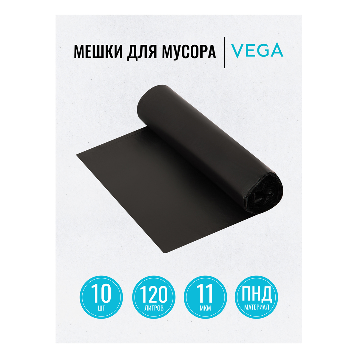 Мешки для мусора VEGA производятся из полиэтилена низкого давления (ПНД). Мешки объемом 120 литров размера 60*70 см плотностью 11 мкм используются для хозяйственных, промышленных нужд. В рулоне 10 штук. <br/>ПНД – тонкий, шуршащий материал химически нейтральный, не вступает в реакцию с жирами и кислотами и не подвержен гниению. <br/>• объем мешков: 120 л.;<br/>• плотность: 11 мкм;<br/>• размер: 67*102 см (+-5%);<br/>• количество: 10 штук.