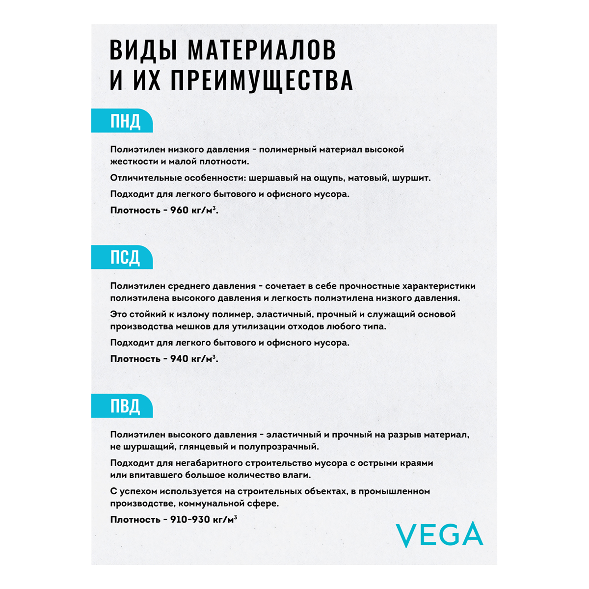 Мешки для мусора VEGA производятся из полиэтилена низкого давления (ПНД). Мешки объемом 120 литров размера 60*70 см плотностью 11 мкм используются для хозяйственных, промышленных нужд. В рулоне 10 штук.